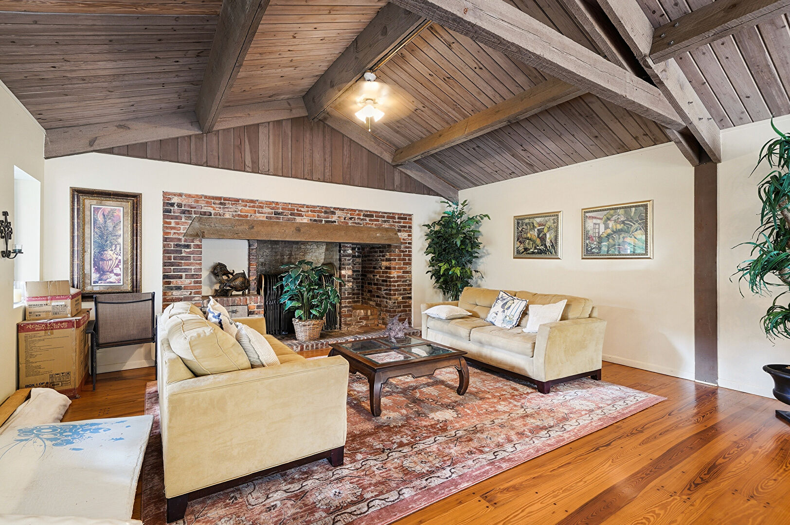 Baseboards Wall, Beamed Ceiling, Cathedral Ceiling, Ceiling Fan, Drywall, Fireplace, Natural Light, Recessed Lighting, Vaulted Ceiling, Vent, Wood Ceiling, Wood Finish Floor, Baseboards Wall, Ceiling Fan, Drywall, Stairs