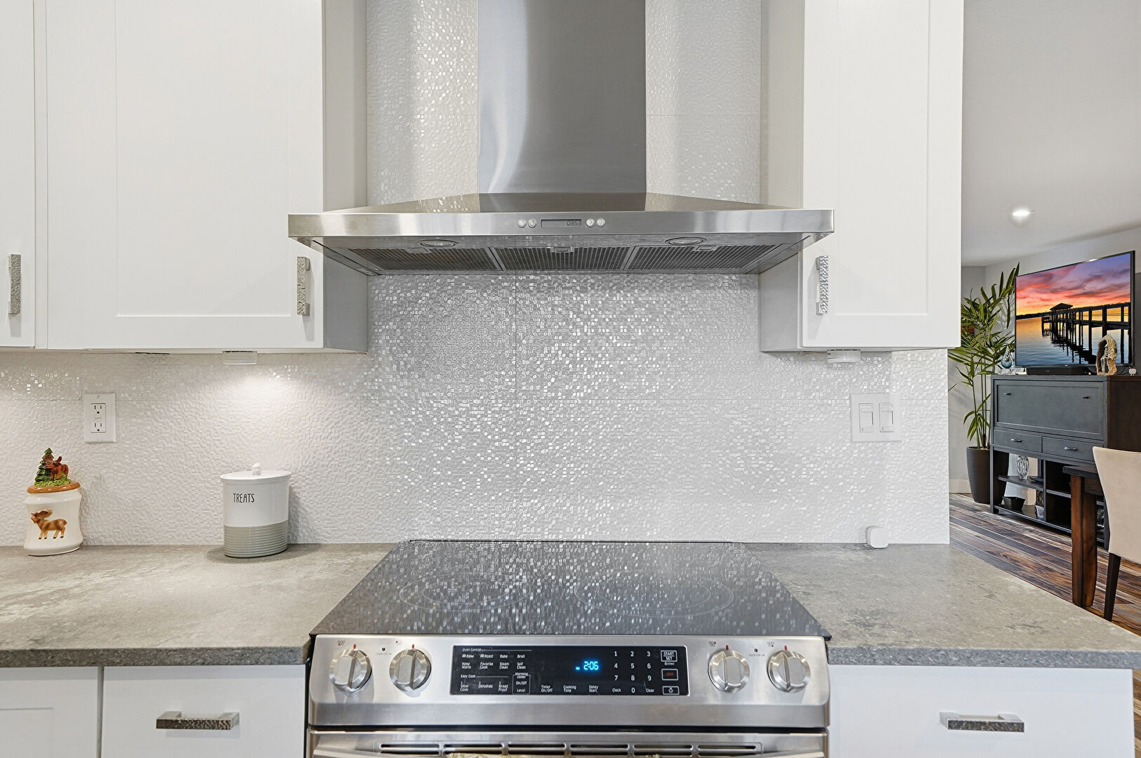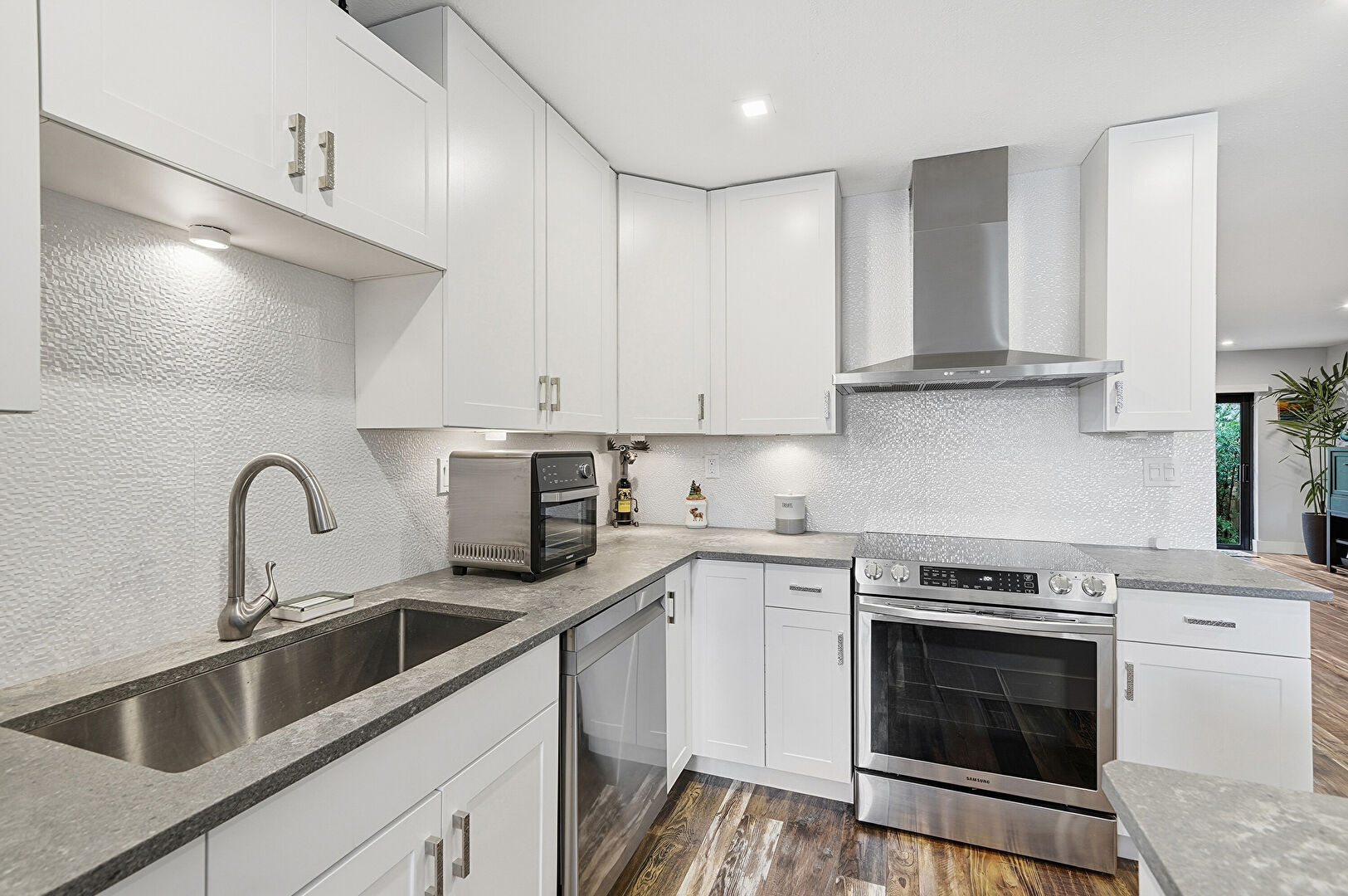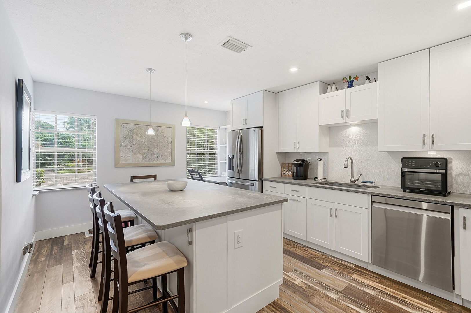 Baseboards Wall, Drywall, Kitchen Bar, Kitchen Island, L Shaped Kitchen, Natural Light, Open Shelves, Opens To Living Area, Pendant Lighting, Recessed Lighting, Shaker Cabinets, Stone Countertops, Toaster, Vent, Wood Finish Floor, Natural Light, Recessed Lighting, Shaker Cabinets, Wood Finish Floor