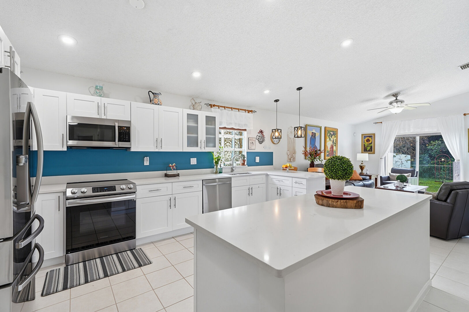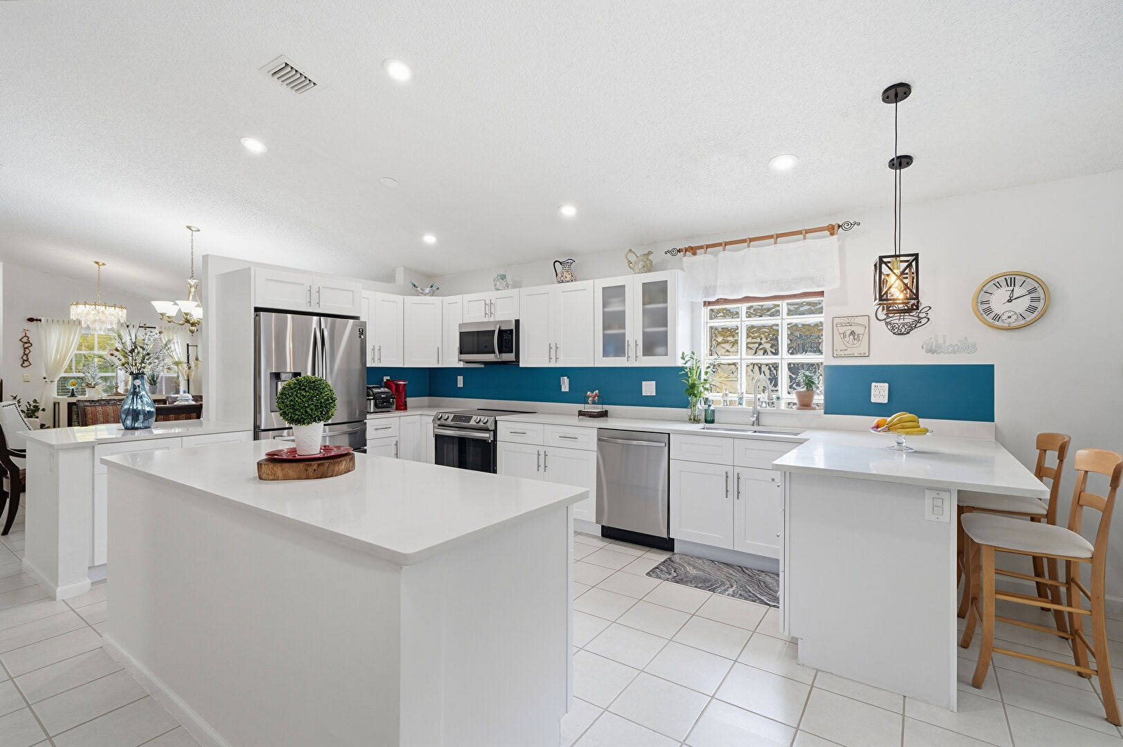 Baseboards Wall, Ceiling Fan, Drywall, G Shaped Kitchen, Glass Insert Cabinets, Kitchen Bar, Kitchen Island, Kitchen Peninsula, Natural Light, Notable Chandelier, Opens To Living Area, Pendant Lighting, Recessed Lighting, Shaker Cabinets, Stone Countertops, Textured Ceiling, Tile Floor, Toaster, U Shaped Kitchen, Vaulted Ceiling, Vent, Ceiling Fan, Kitchen Island, Natural Light, Pendant Lighting, Recessed Lighting, Tile Floor