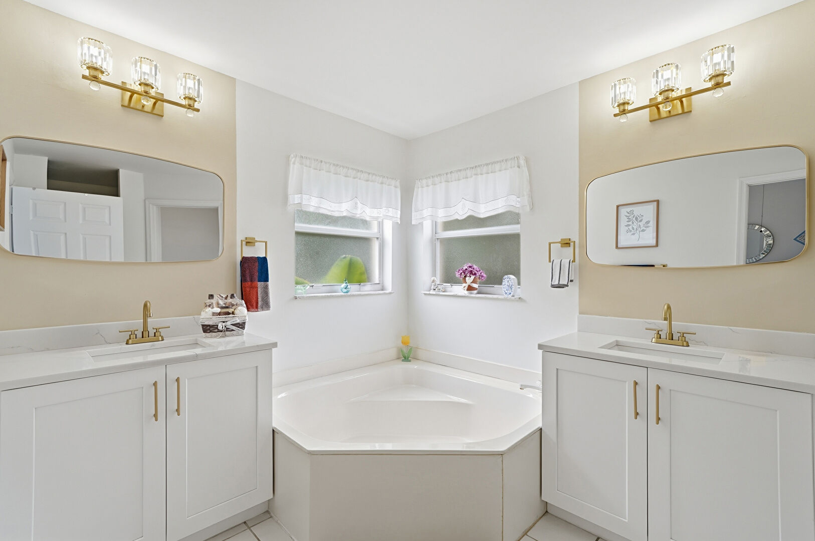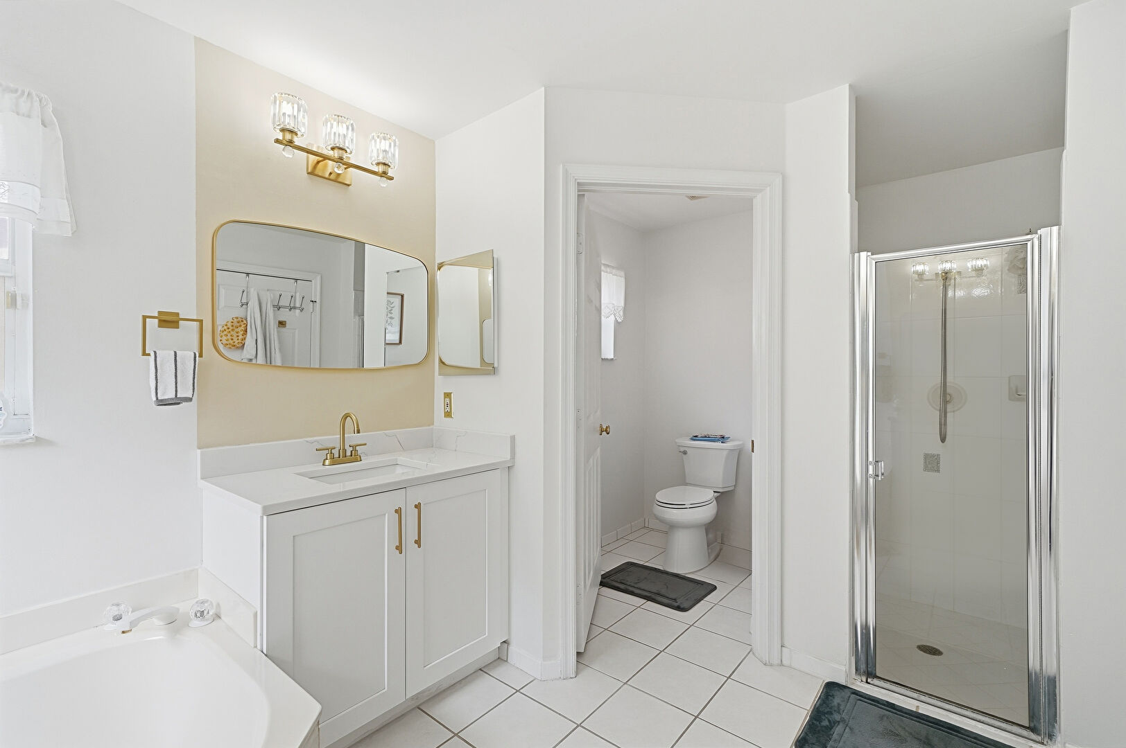 Baseboards Wall, Ceiling Fan, Drywall, Ensuite Bathroom, Full Bathroom, Natural Light, Tile Floor, Vanity, Vent, Water Closet, Baseboards Wall, Two Single Vanities, Vanity