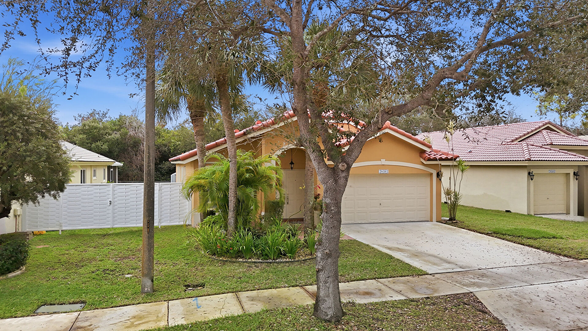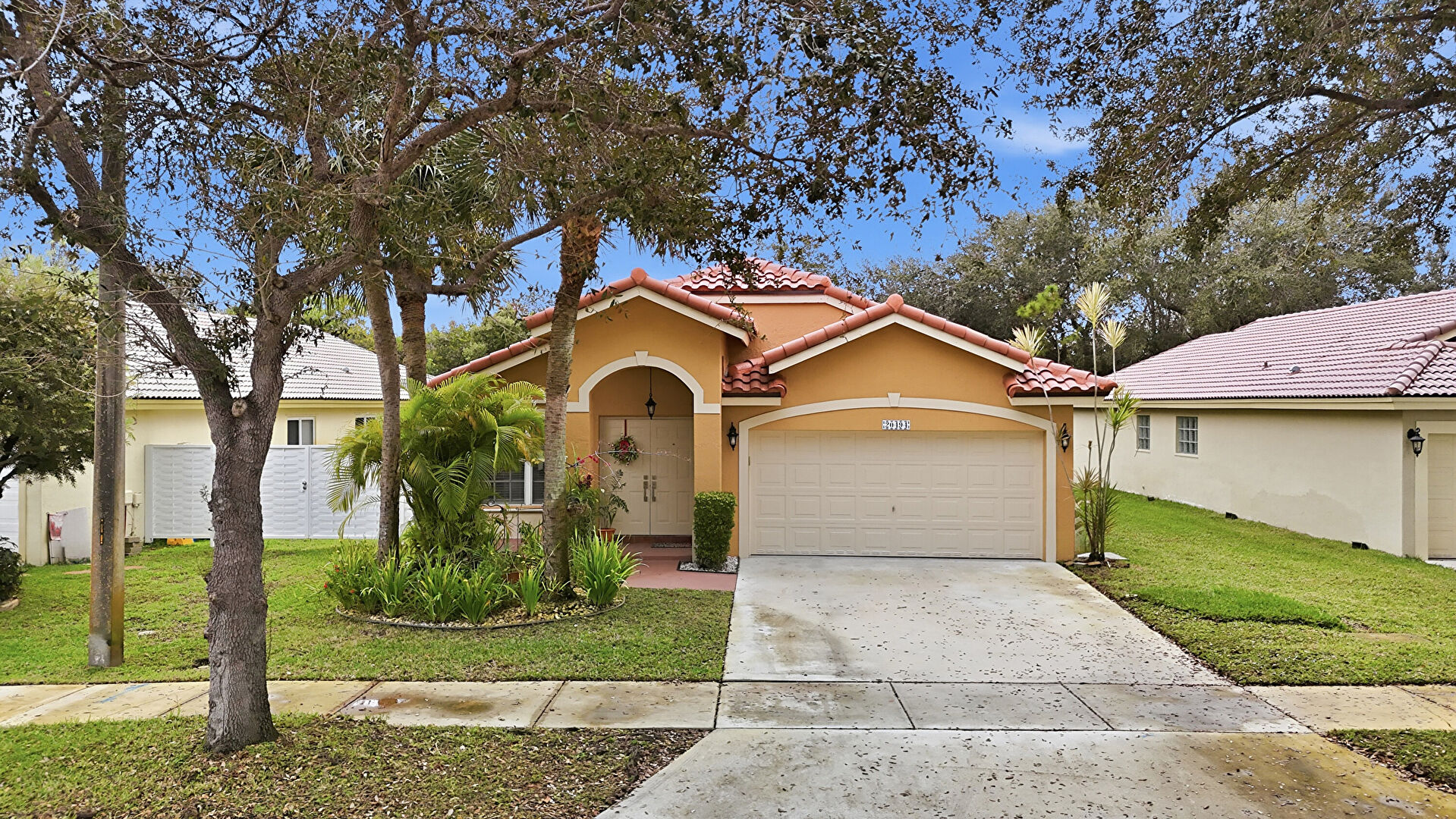 Driveway, Lawn, Stucco Siding, Tile Roof, Fence