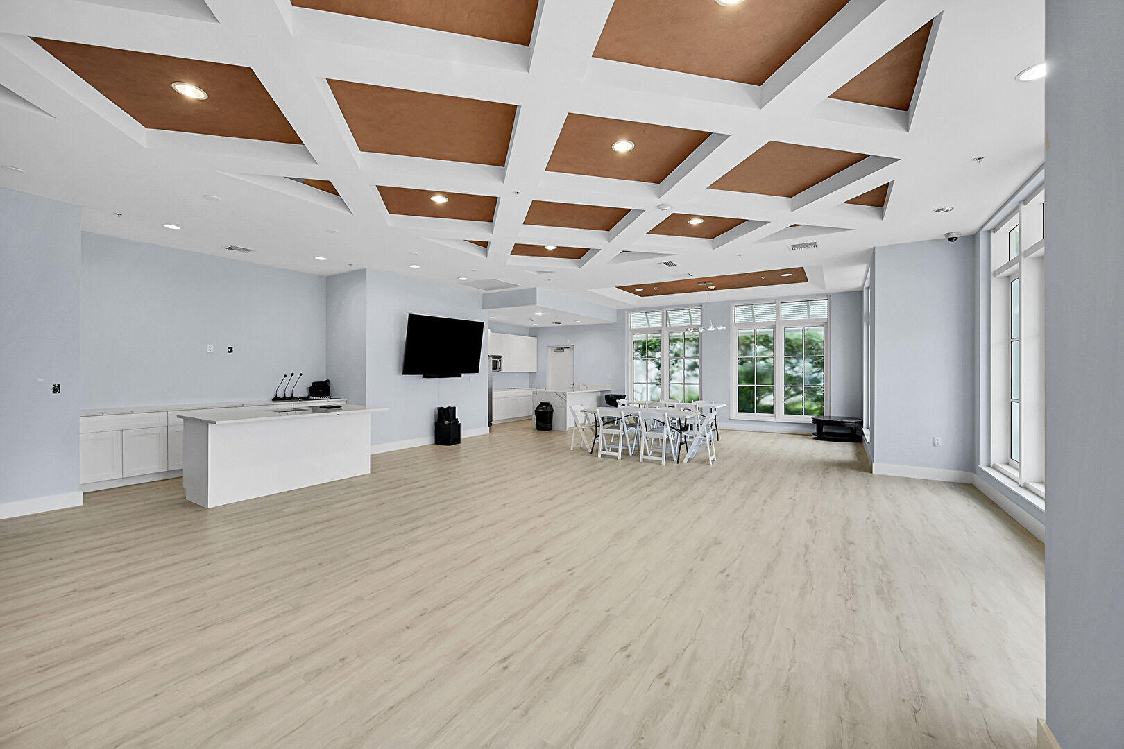 Baseboards Wall, Beamed Ceiling, Coffered Ceiling, Natural Light, Recessed Lighting, Vinyl Floor, Wood Finish Floor, Drywall