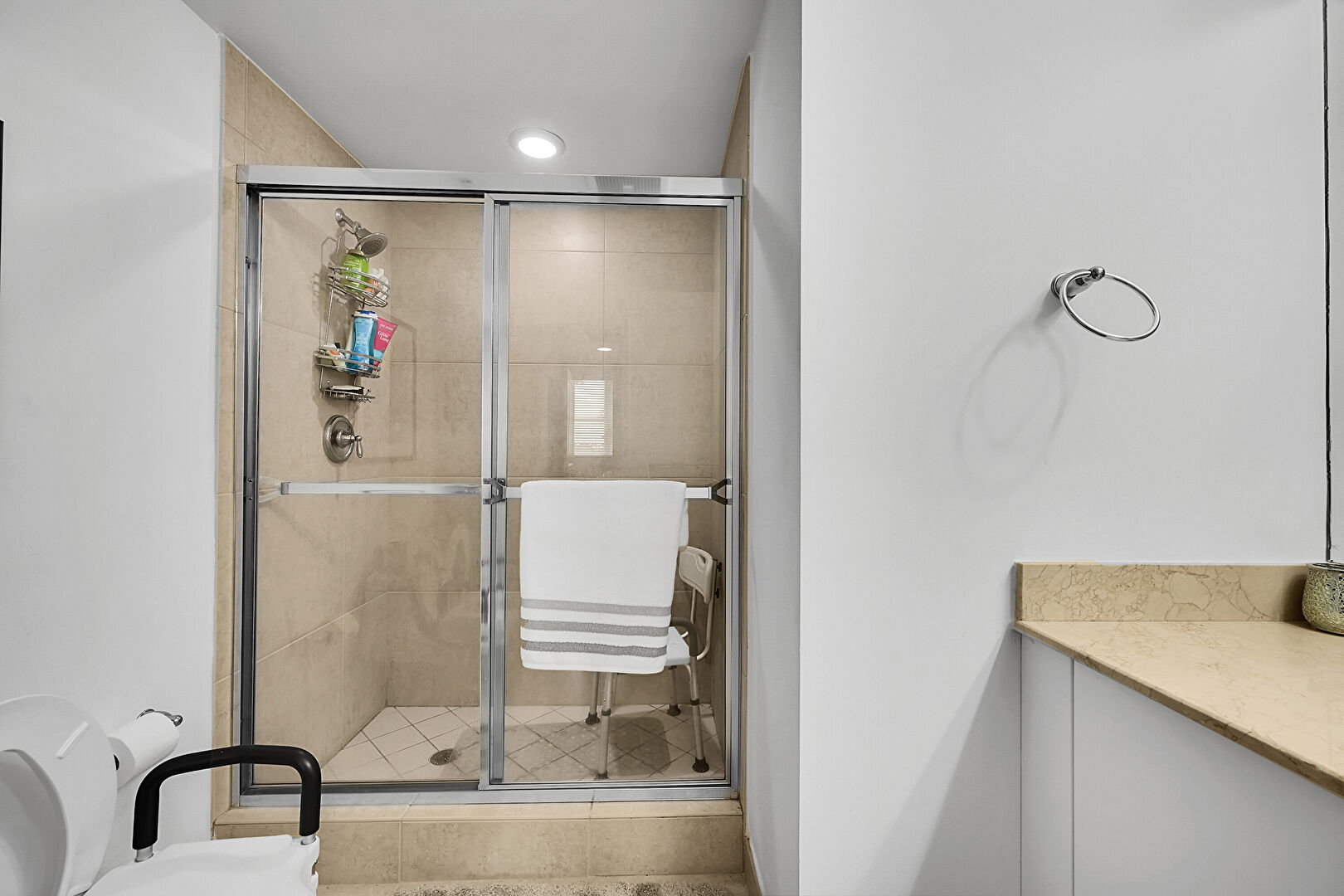 Full Bathroom, Recessed Lighting, Sauna, Tile Floor, Tile Wall, Wainscot Wall, Drywall