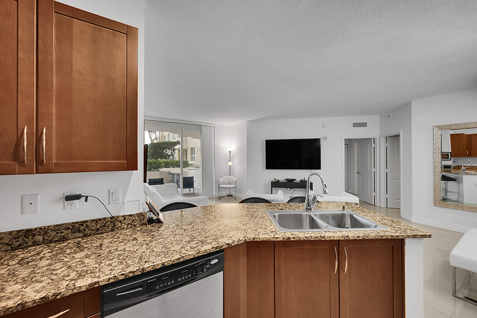 Baseboards Wall, Drywall, Floor Ceiling Windows, Kitchen Bar, Kitchen Peninsula, Medium Brown Cabinets, Natural Light, Opens To Living Area, Shaker Cabinets, Stone Countertops, Textured Ceiling, Tile Floor, Toaster, Track Lighting, U Shaped Kitchen, Vent, Drywall, Kitchen Bar, Medium Brown Cabinets, Textured Ceiling