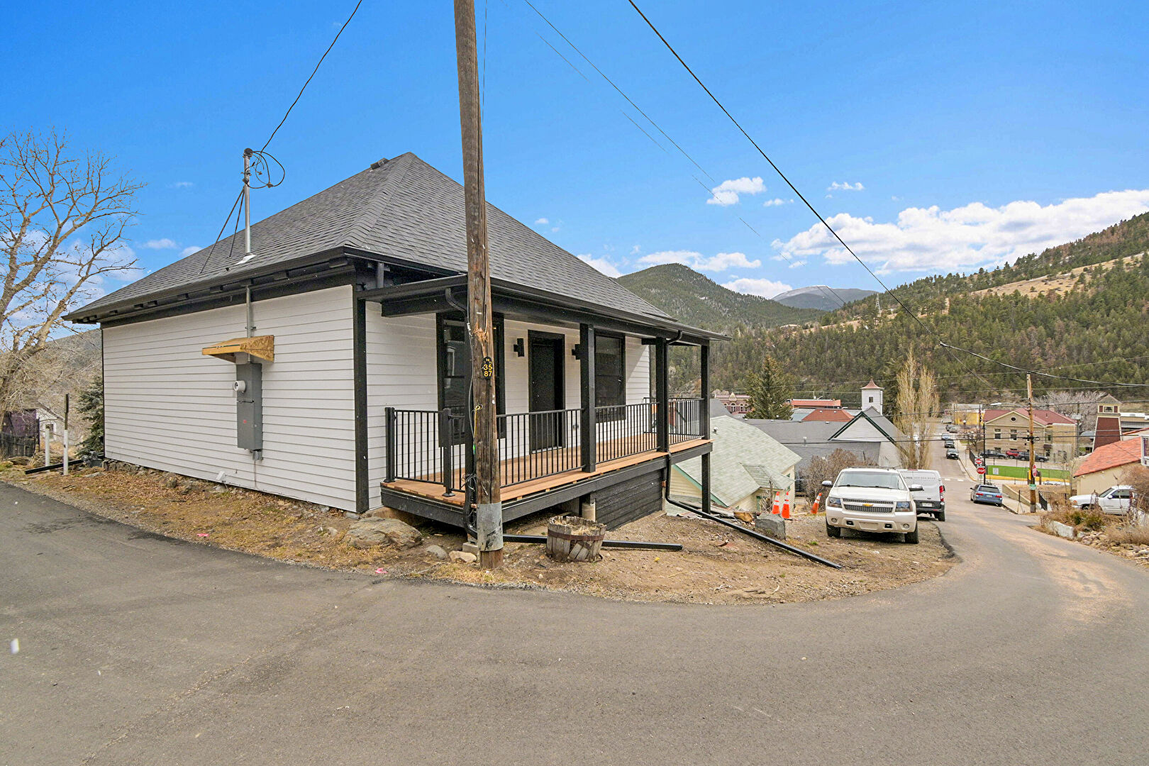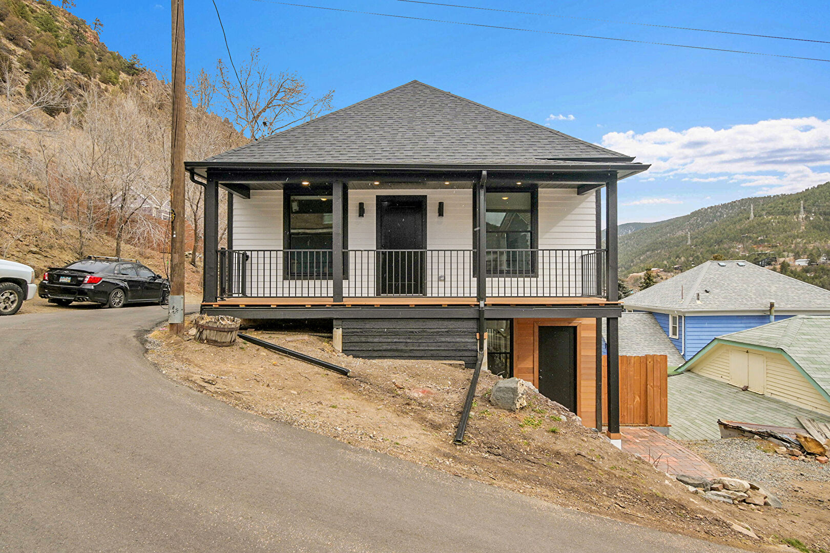 Basement Walk Out, Downspout, Fence, Gutters, Horizontal Siding, Mountain View, Patio, Porch, Shingle Roof, Gutters, Porch