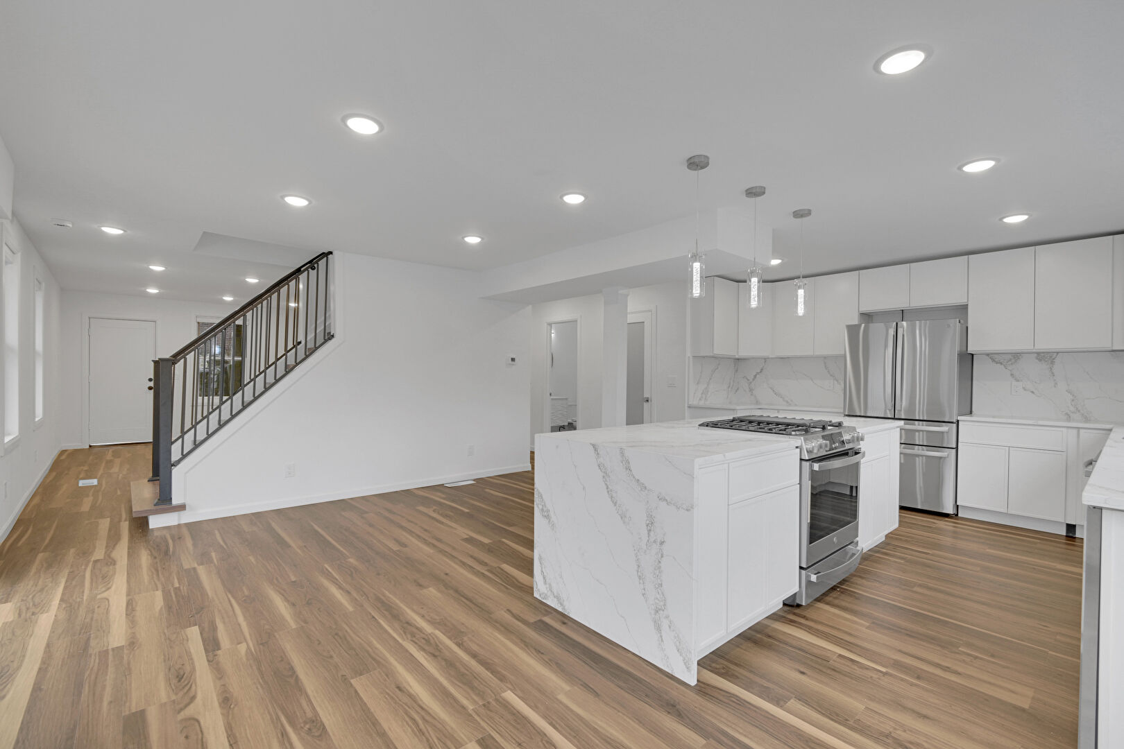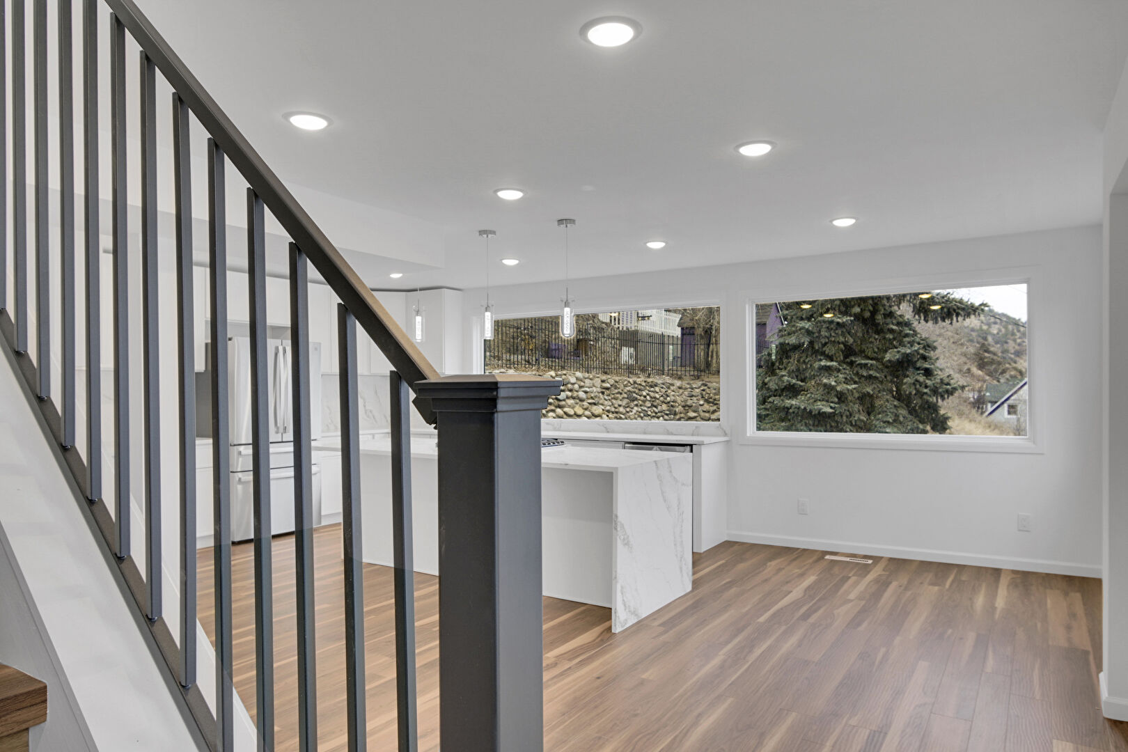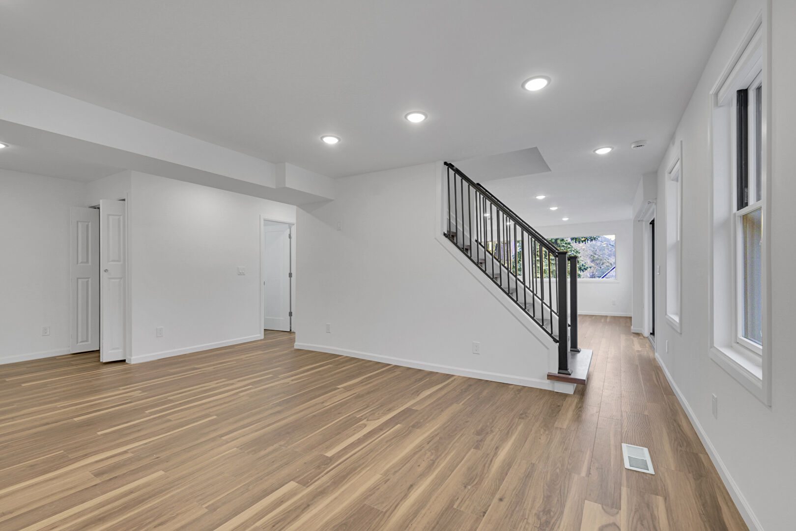 Baseboards Wall, Drywall, Natural Light, Recessed Lighting, Stairs, Vent, Wood Finish Floor, Natural Light, Stairs, Vent