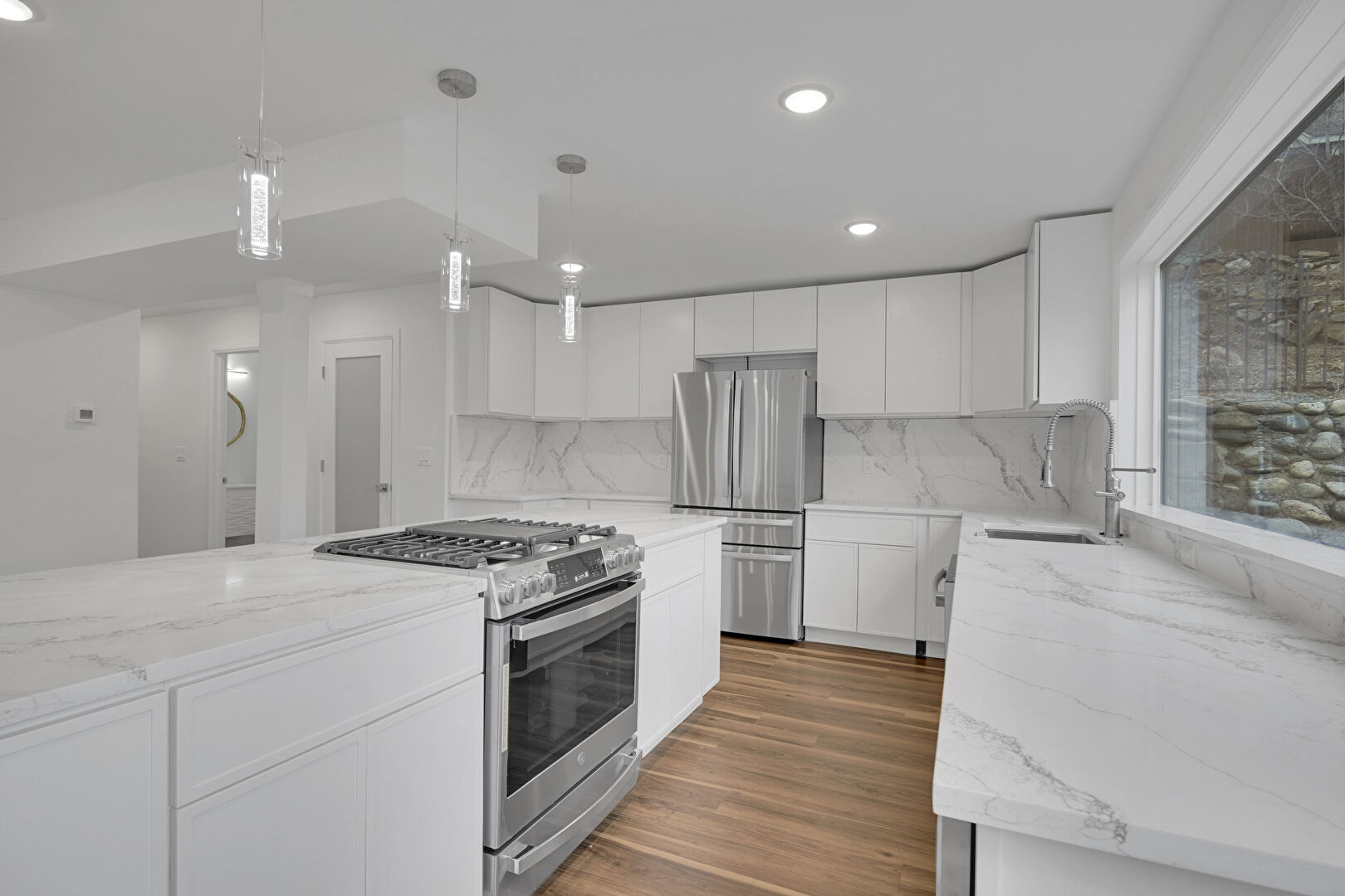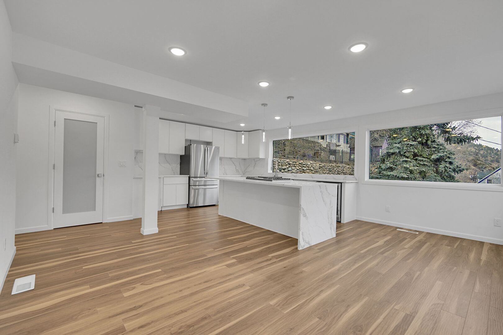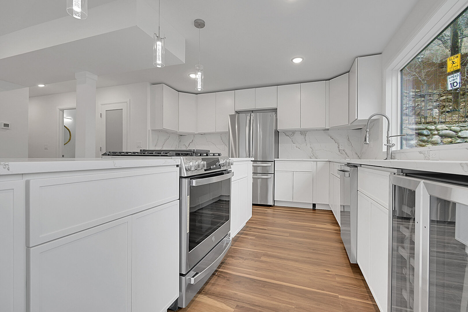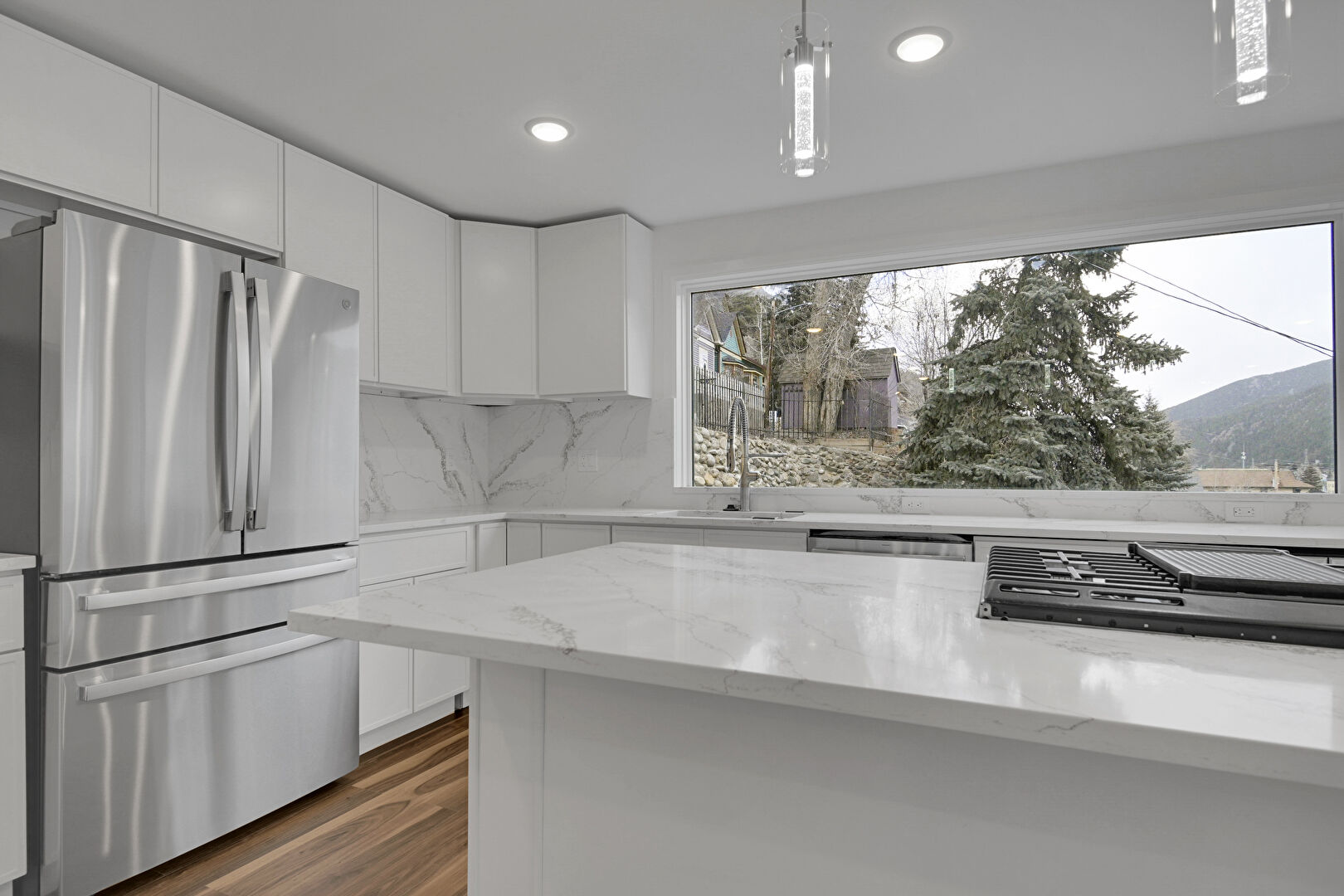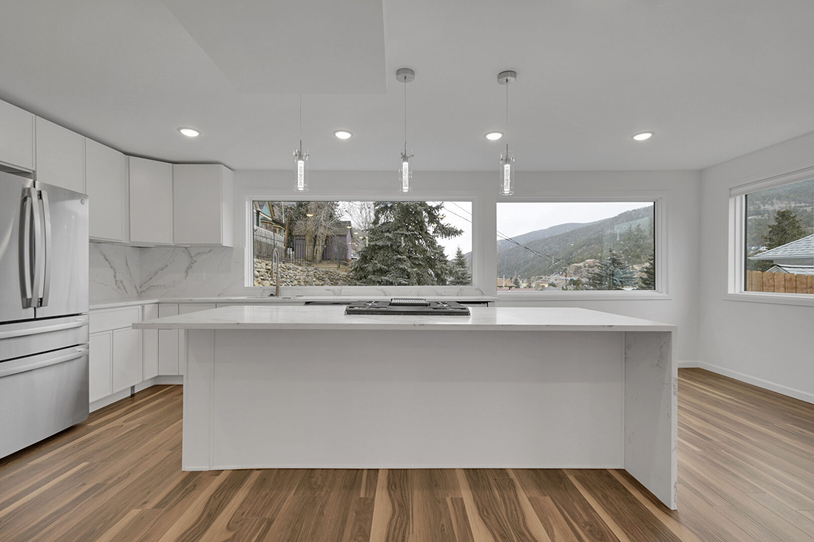 Baseboards Wall, Drywall, Flat Panel Cabinets, Kitchen Bar, Kitchen Island, L Shaped Kitchen, Mountain View, Natural Light, Opens To Living Area, Pendant Lighting, Recessed Lighting, Shaker Cabinets, Stone Countertops, Vent, Wine Cooler, Wood Finish Floor, Flat Panel Cabinets, Kitchen Island, Pendant Lighting, Recessed Lighting, Stone Countertops, Wood Finish Floor