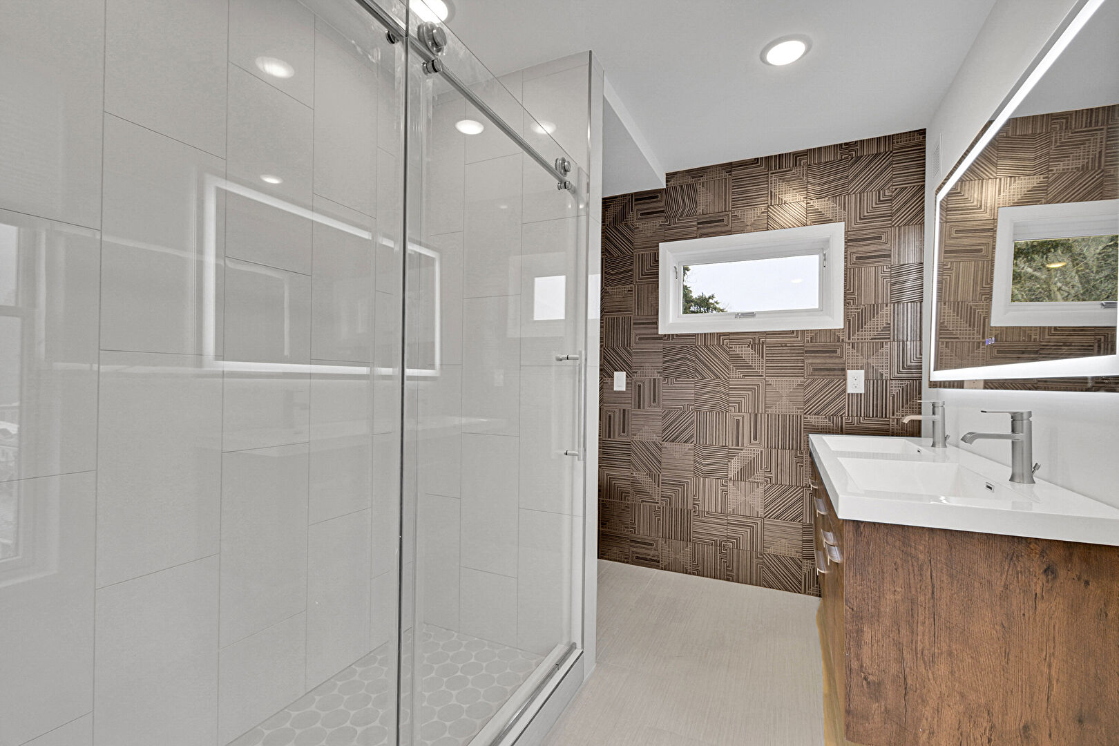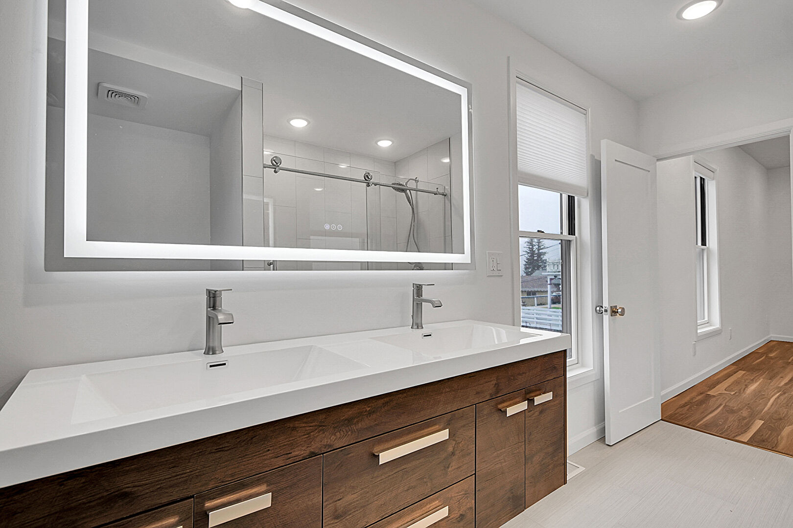 Baseboards Wall, Drywall, Full Bathroom, Half Bathroom, Natural Light, Recessed Lighting, Tile Floor, Tile Wall, Vanity, Vent, Wood Finish Floor, Double Vanity, Natural Light, Vanity