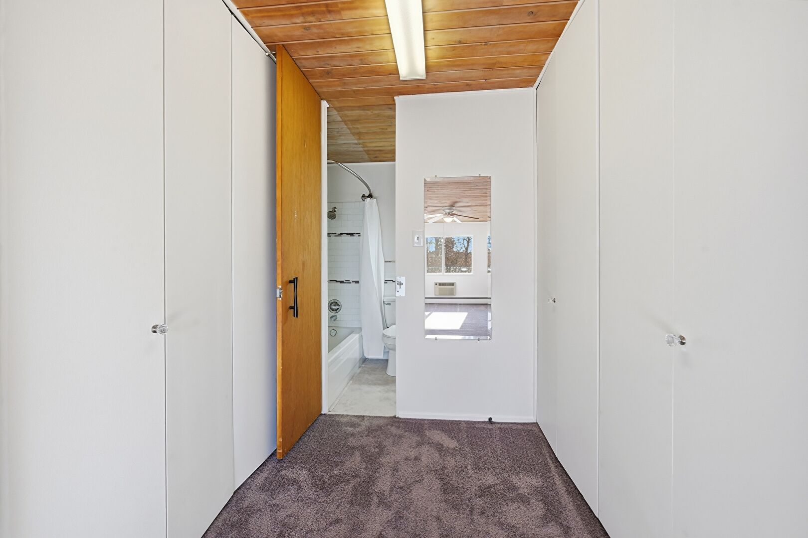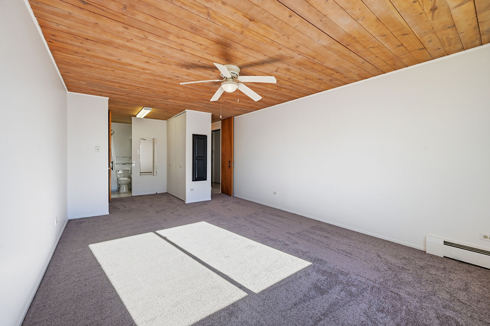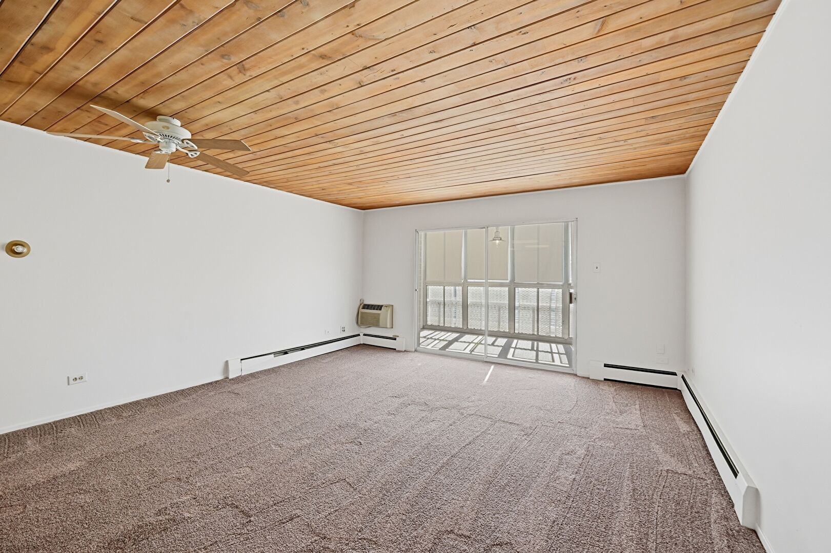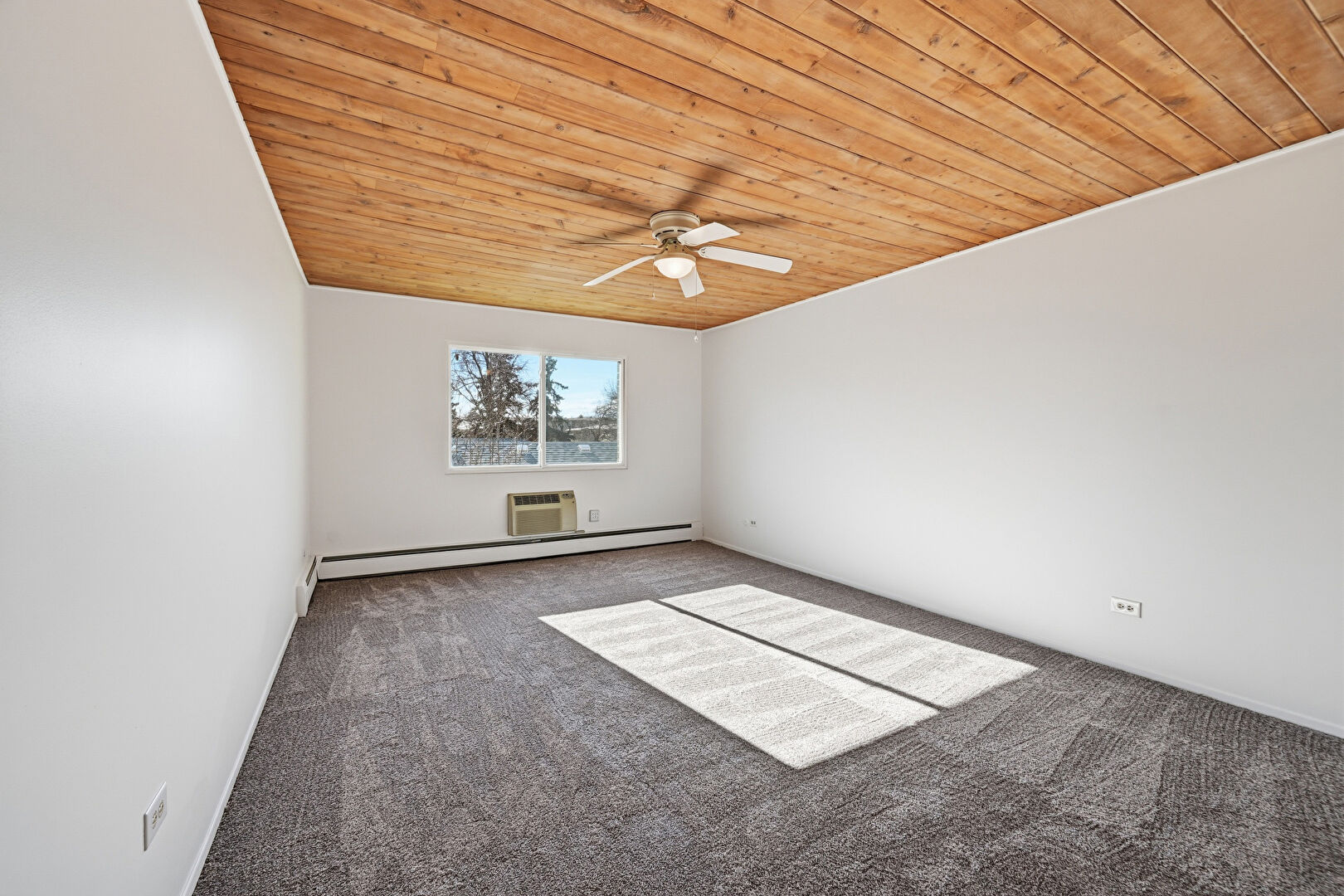 Baseboard Radiator, Baseboards Wall, Carpet, Ceiling Fan, Closet, Drywall, Ensuite Bathroom, Natural Light, Wall Mounted Ac, Wood Ceiling, Ceiling Fan, Wood Ceiling