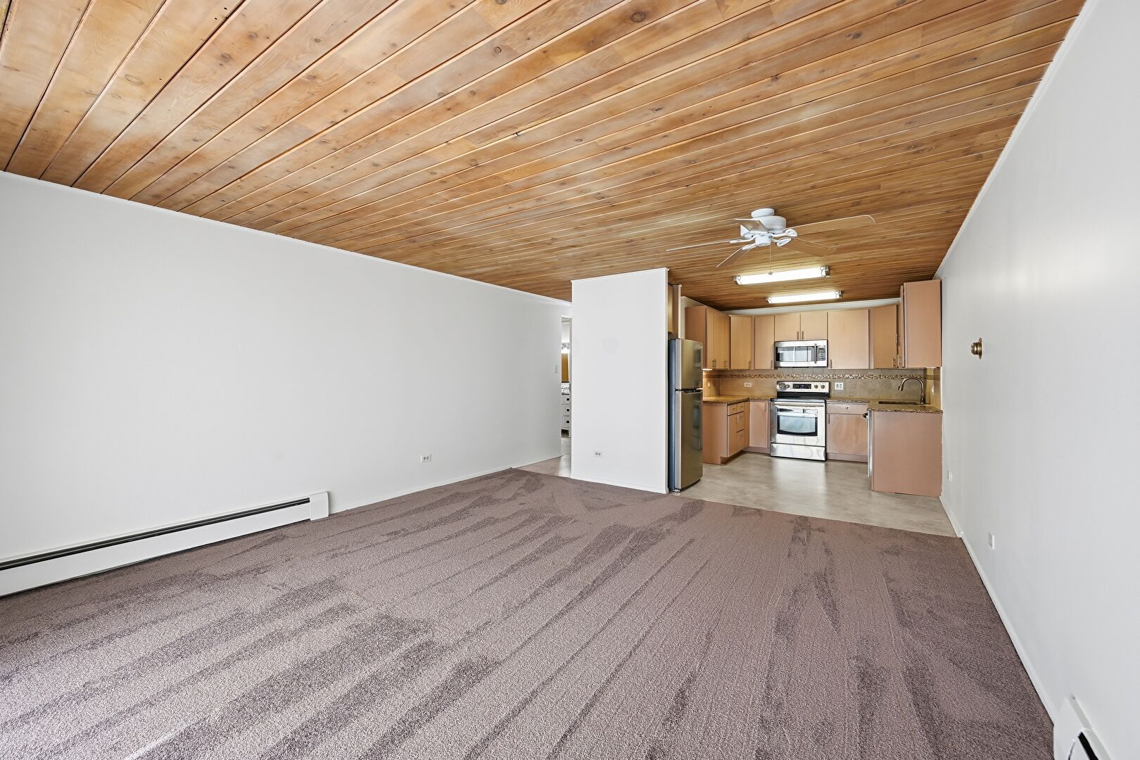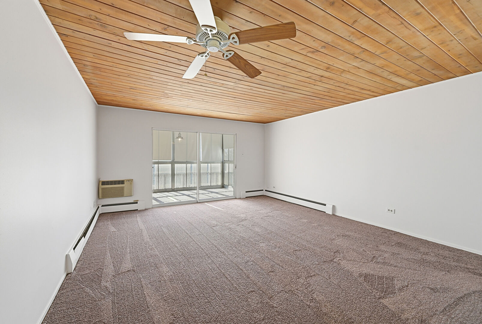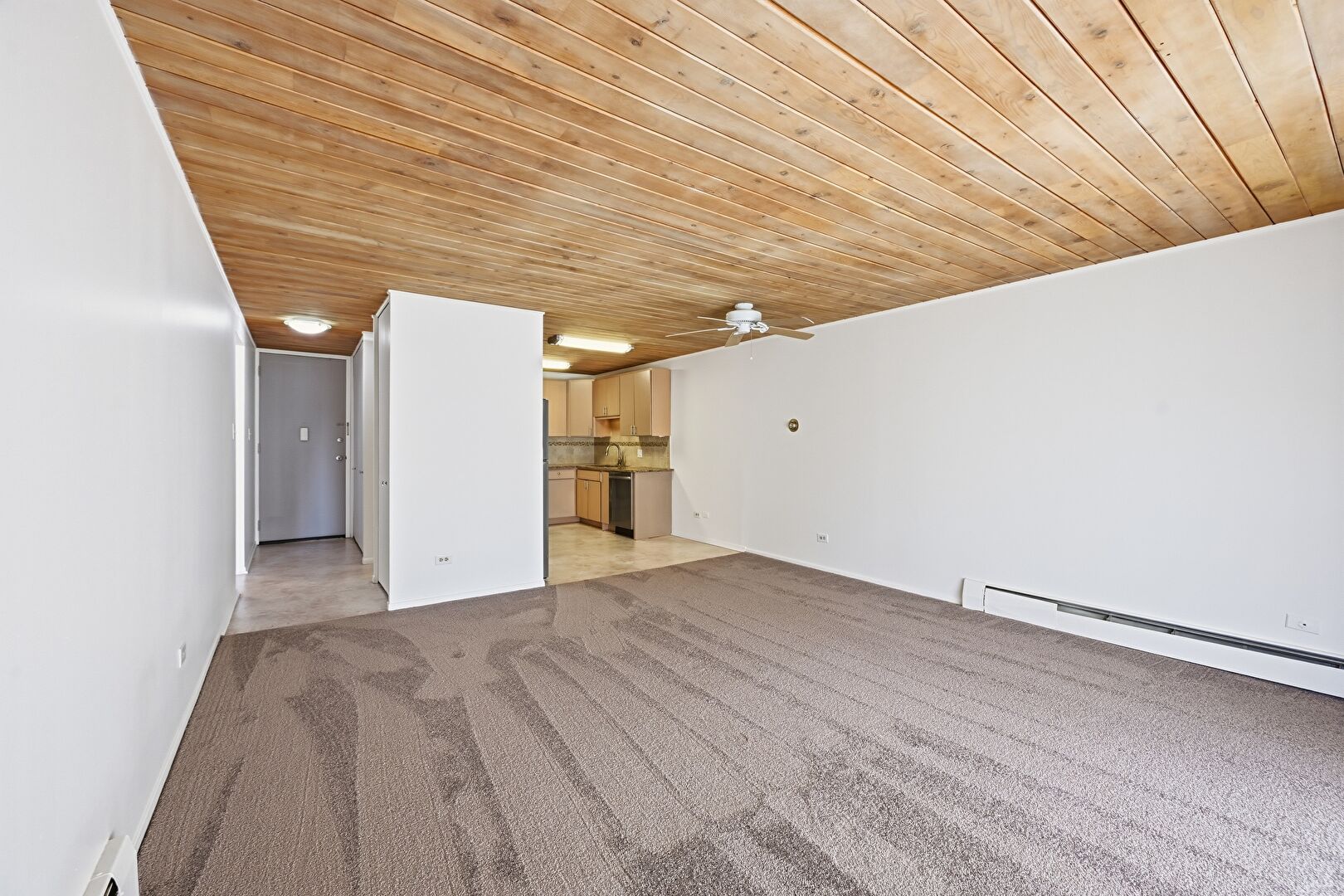 Baseboard Radiator, Baseboards Wall, Carpet, Ceiling Fan, Drywall, Natural Light, U Shaped Kitchen, Wall Mounted Ac, Wood Ceiling, Drywall, Wood Ceiling