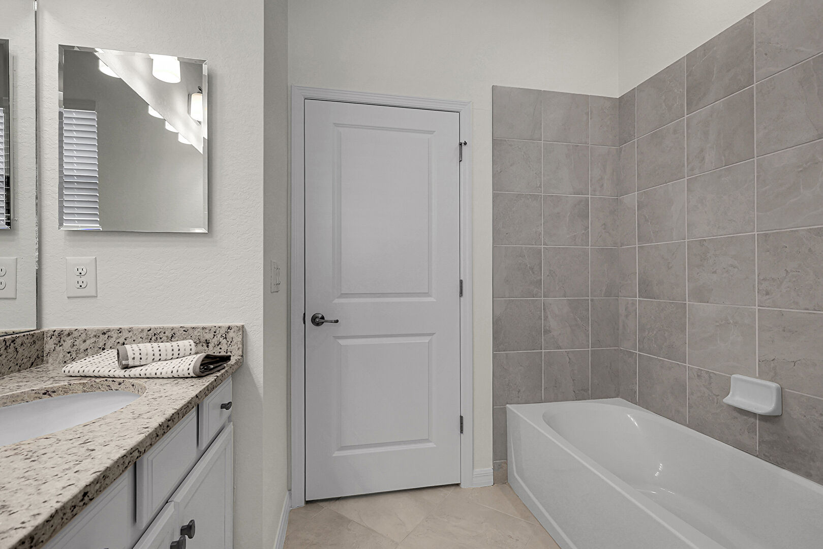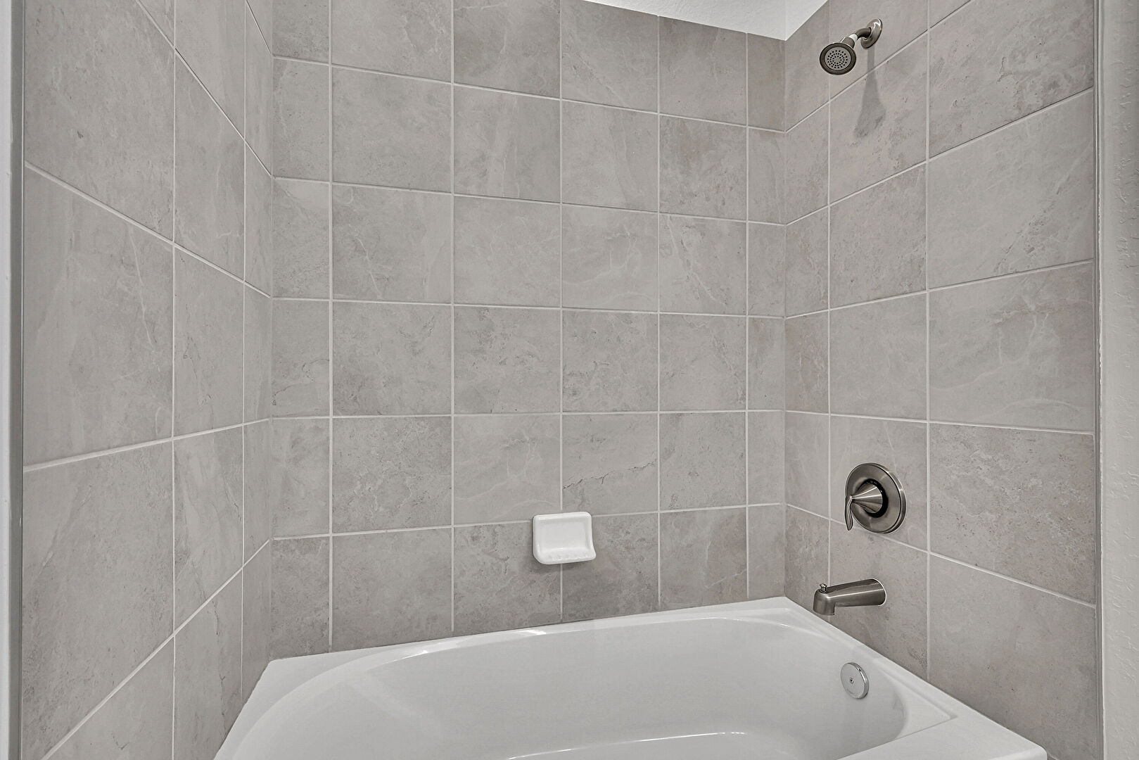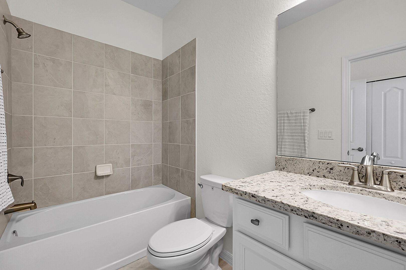 Baseboards Wall, Combined Bath Shower, Double Vanity, Full Bathroom, Natural Light, Textured Wall, Vent, Full Bathroom, Tile Floor
