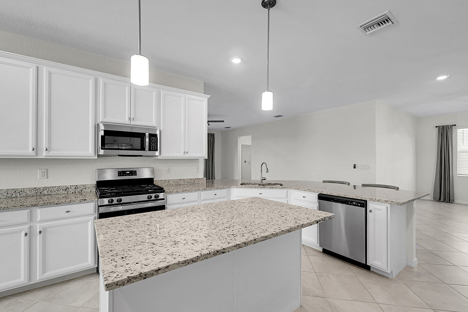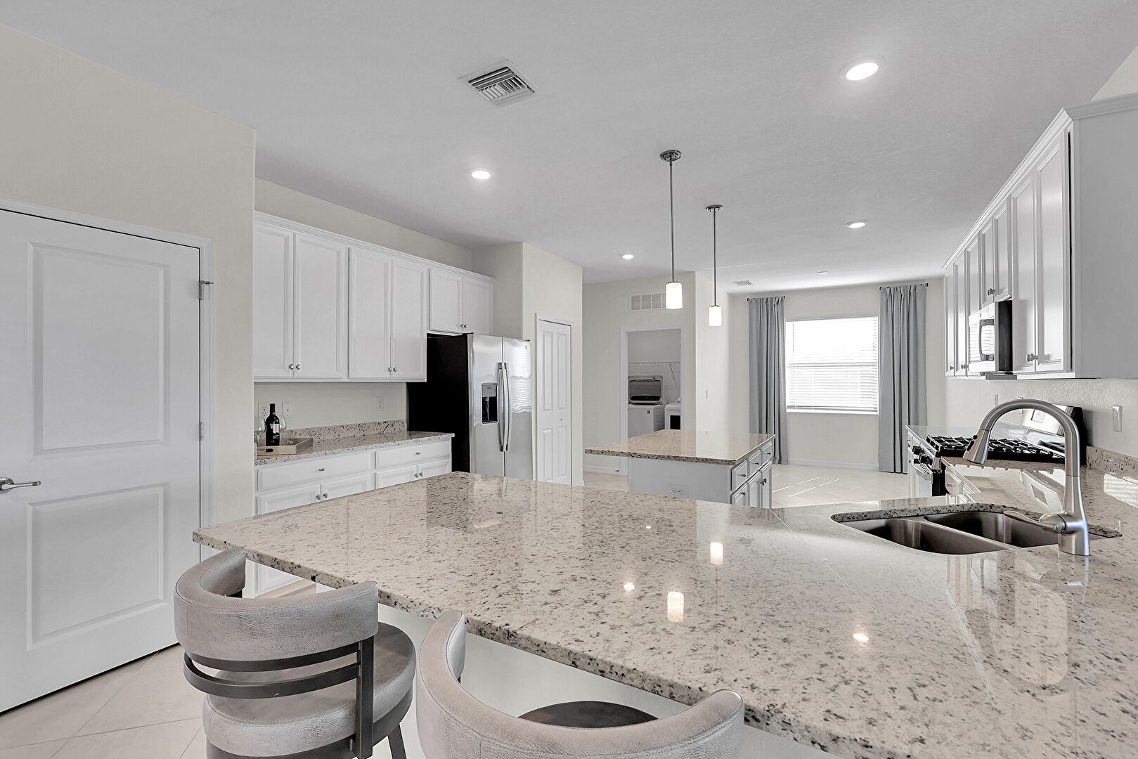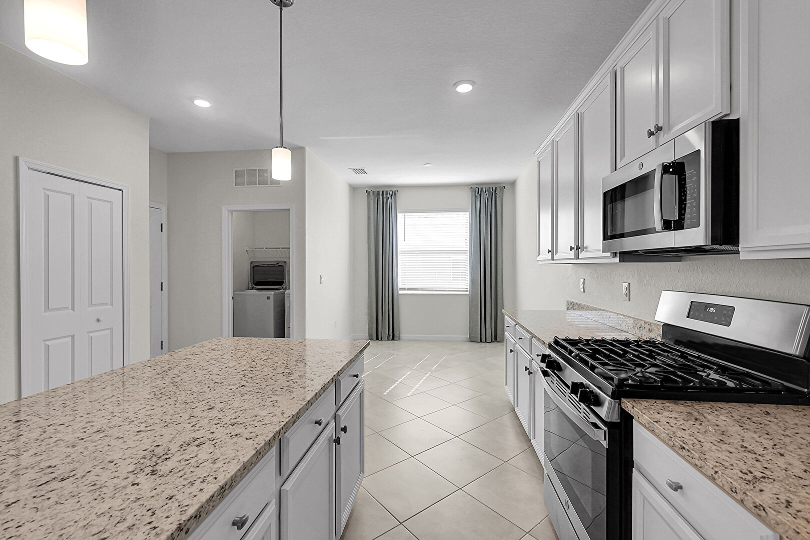 Baseboards Wall, Ceiling Fan, Crown Molding Cabinets, Drywall, Kitchen Bar, Kitchen Island, Kitchen Peninsula, Laundry, Natural Light, Opens To Living Area, Pendant Lighting, Recessed Lighting, Shaker Cabinets, Stone Countertops, Tile Floor, U Shaped Kitchen, Vent, Washer Dryer, Kitchen Peninsula, Natural Light, Opens To Living Area, Shaker Cabinets, Stone Countertops, Tile Floor