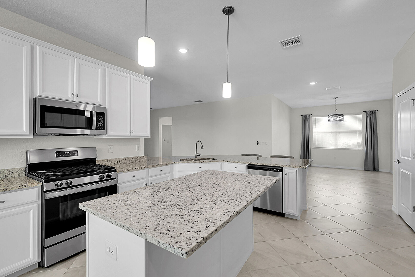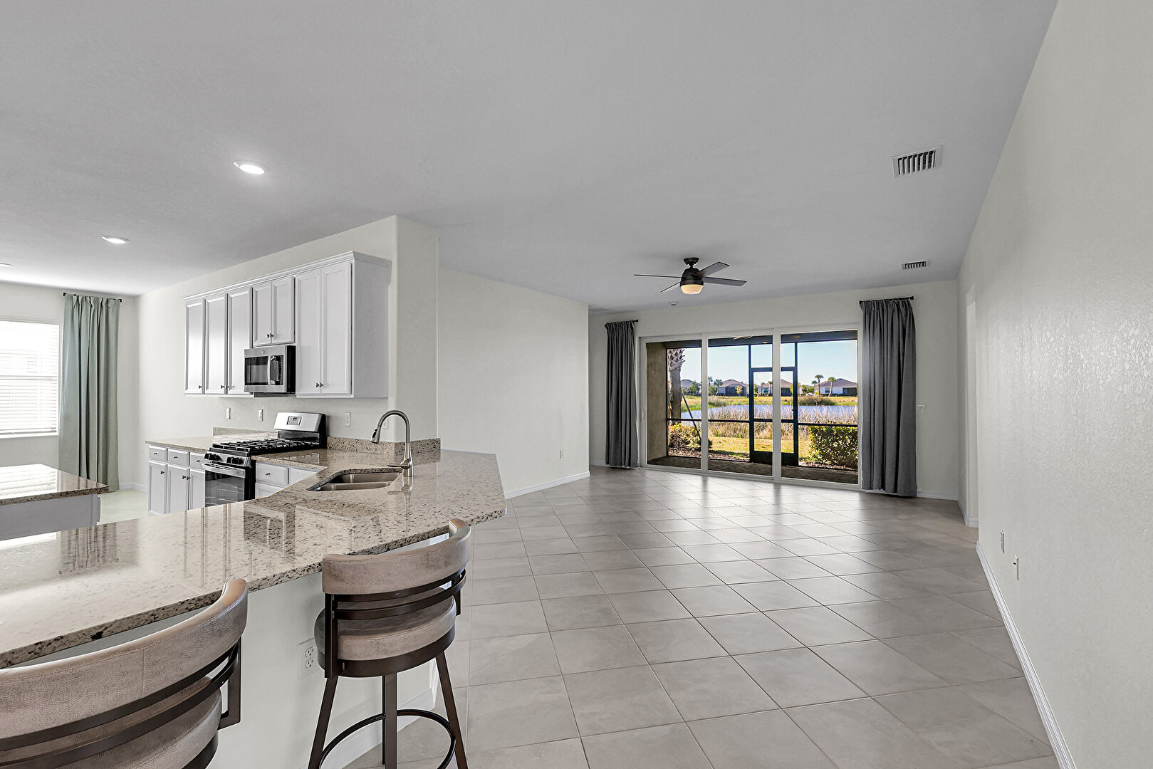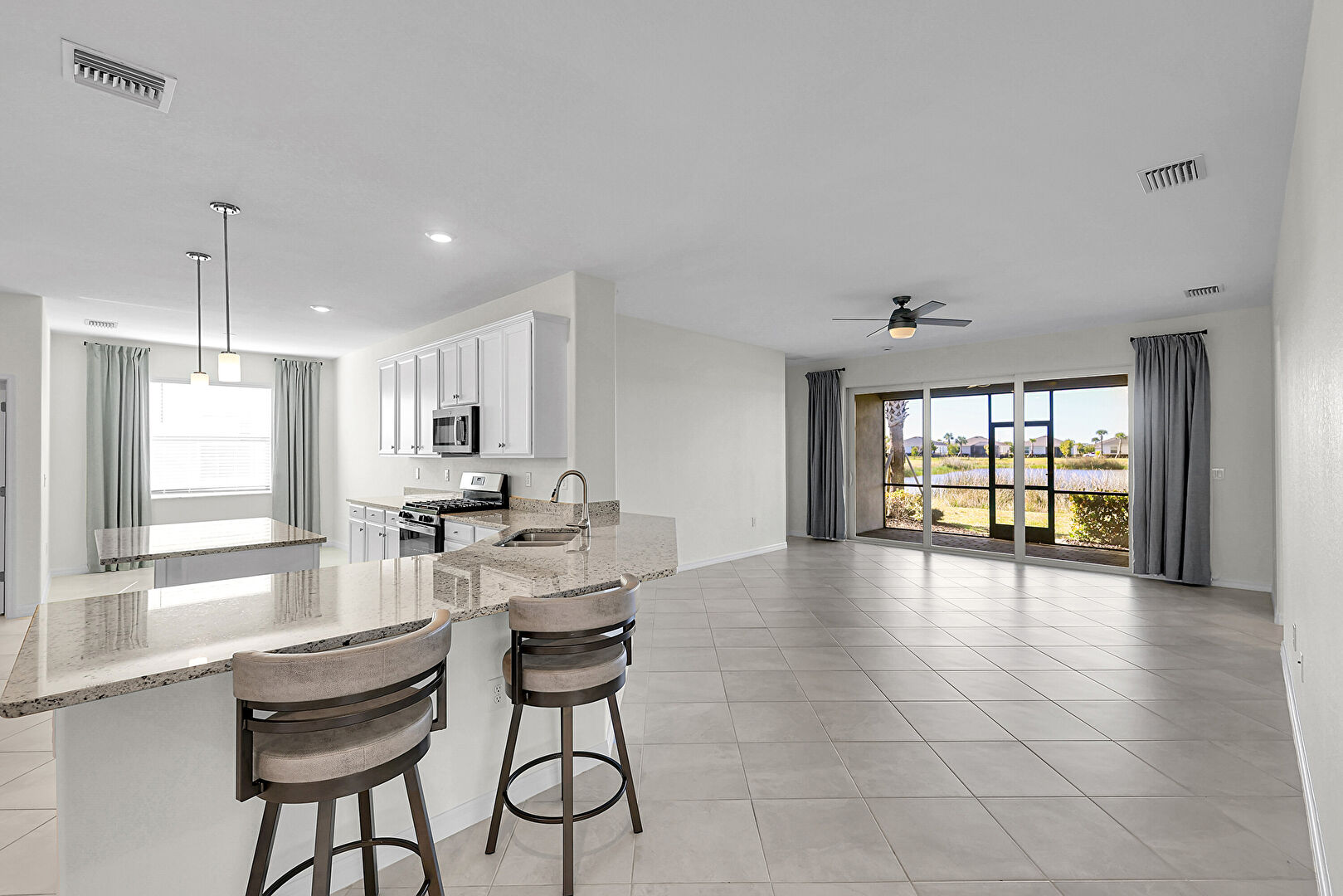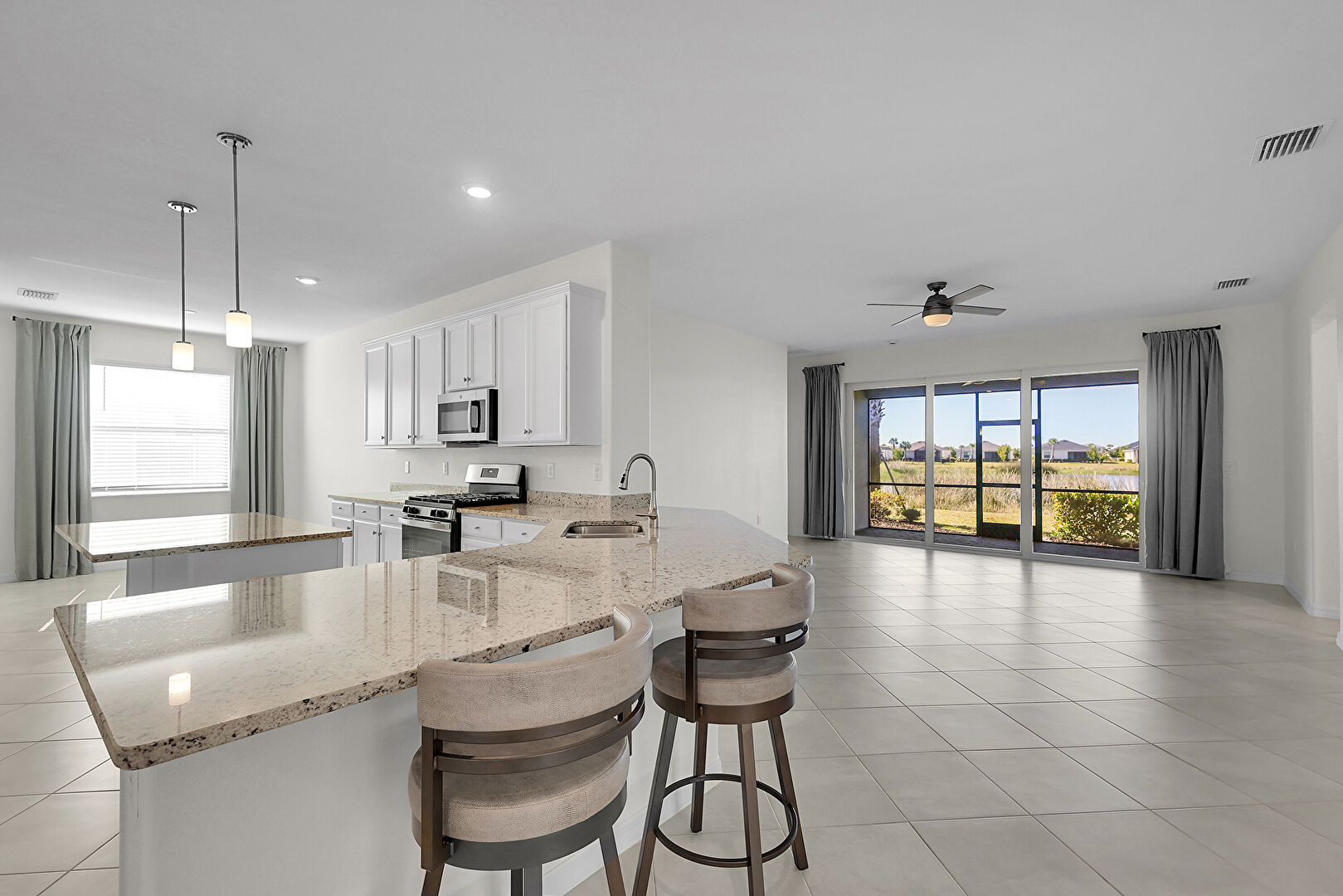Baseboards Wall, Ceiling Fan, Crown Molding Cabinets, Drywall, Kitchen Bar, Kitchen Island, Kitchen Peninsula, L Shaped Kitchen, Natural Light, Opens To Living Area, Pendant Lighting, Recessed Lighting, Shaker Cabinets, Stone Countertops, Tile Floor, Vent, Water View, Waterfront, Kitchen Peninsula, Natural Light, Opens To Living Area, Vent