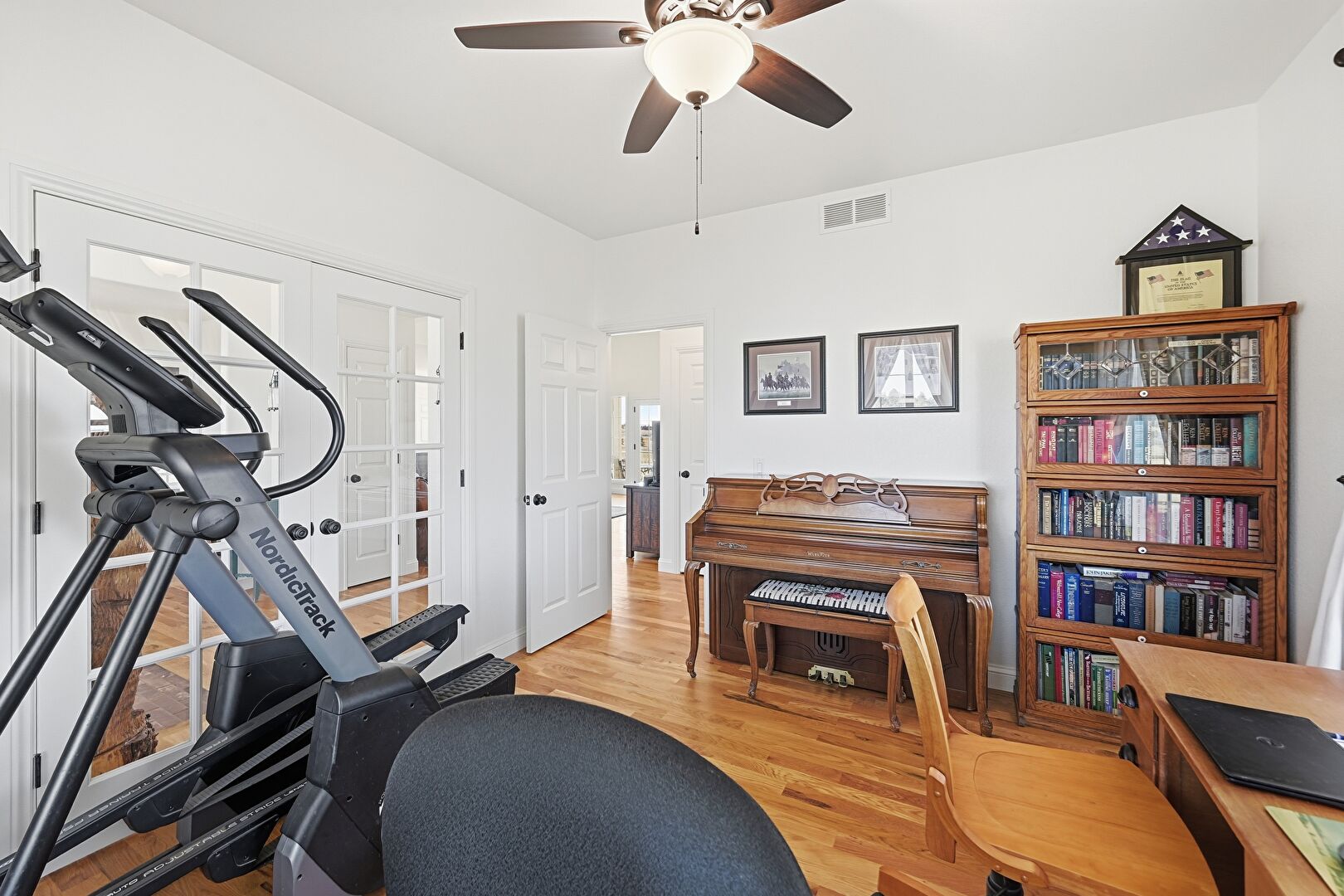 Baseboards Wall, Ceiling Fan, Drywall, French Doors, Natural Light, Office Area, Wood Finish Floor
