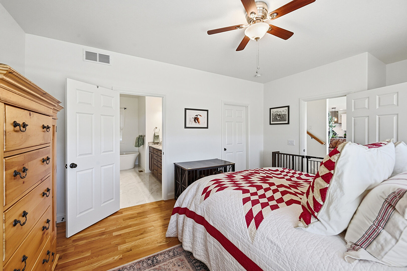 Baseboards Wall, Ceiling Fan, Drywall, Natural Light, Vent, Wood Finish Floor, Ensuite Bathroom, Vent