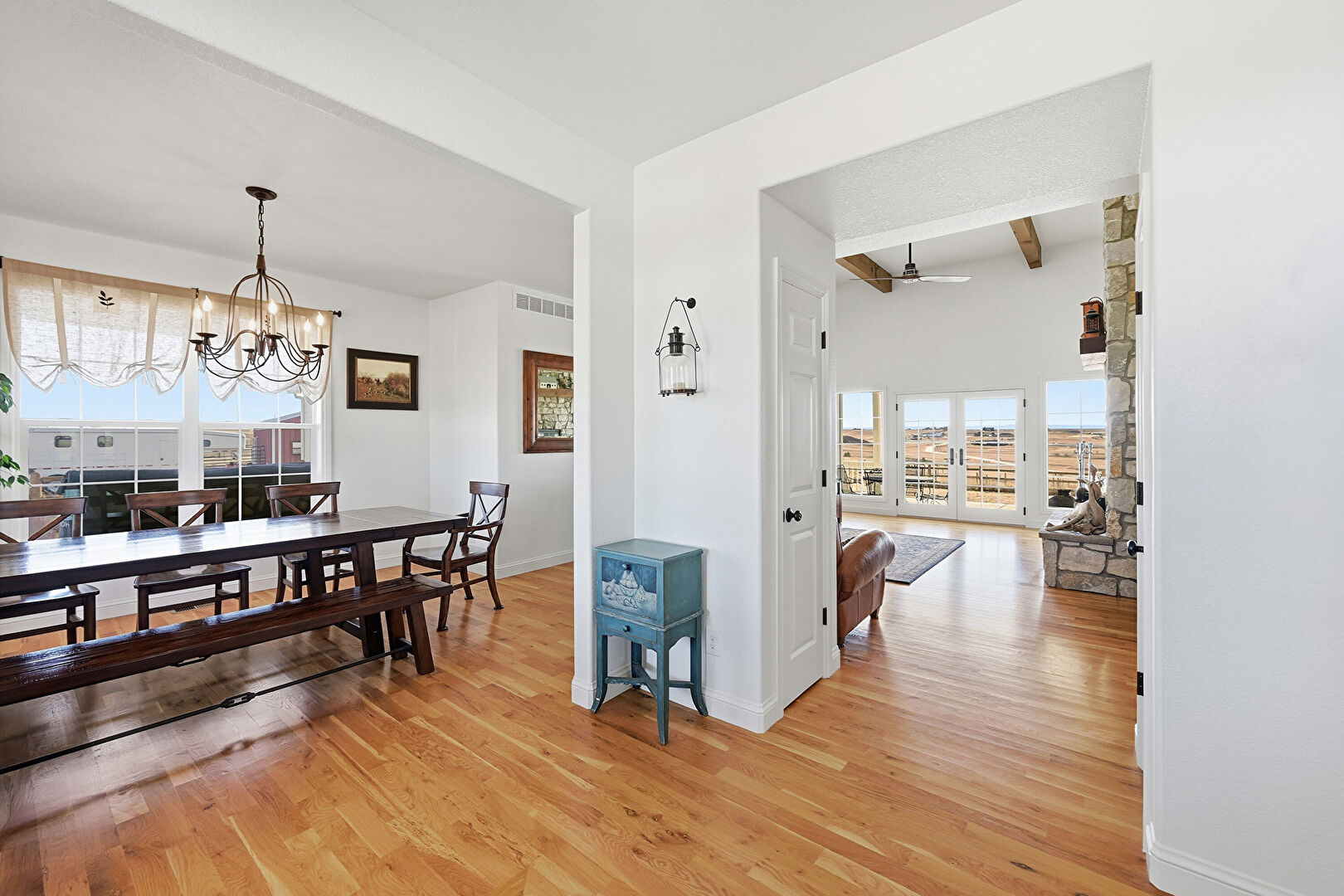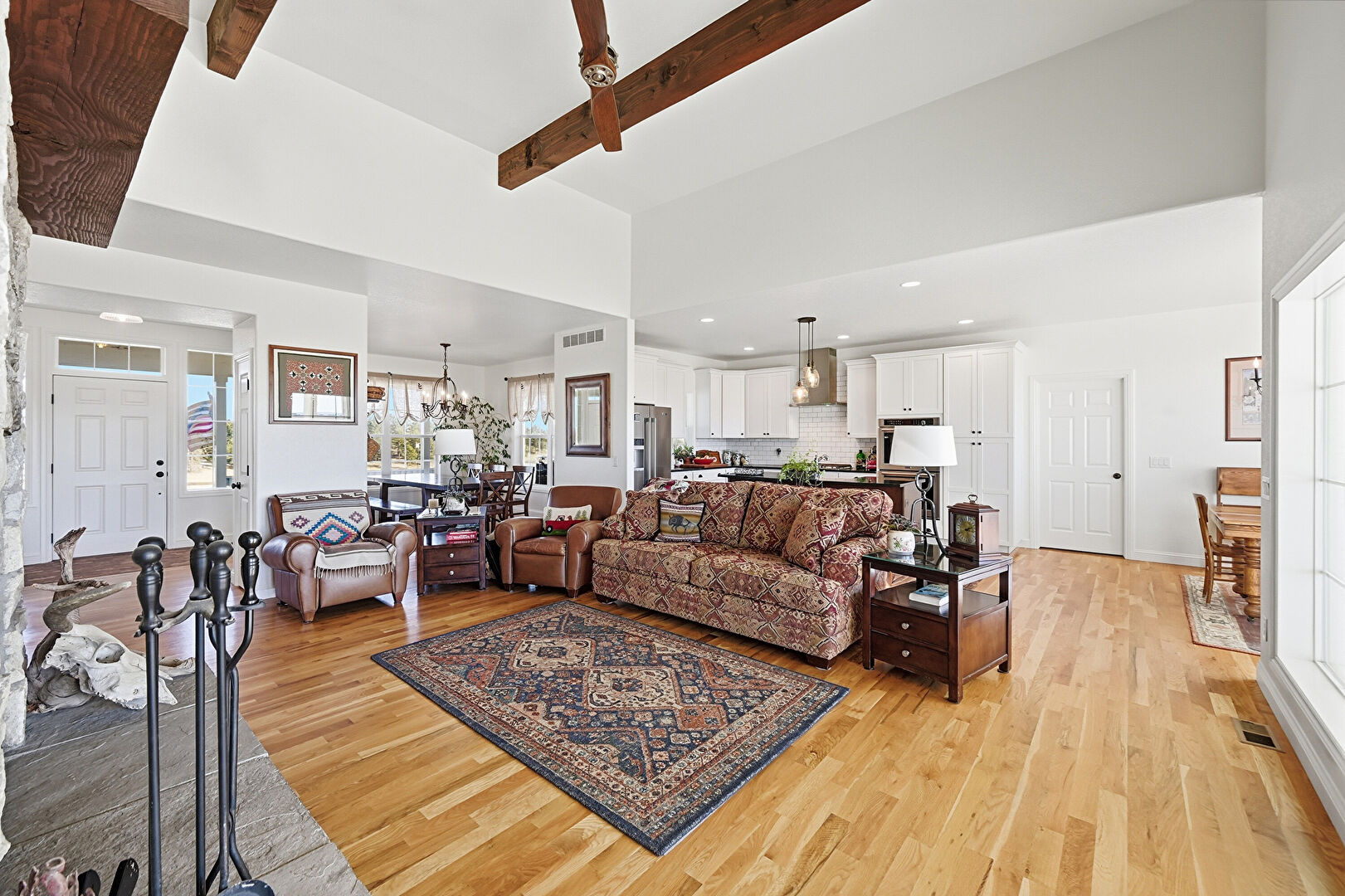 Beamed Ceiling, Ceiling Fan, Drywall, Fireplace, French Doors, High Ceiling, L Shaped Kitchen, Natural Light, Notable Chandelier, Recessed Lighting, Vaulted Ceiling, Wood Finish Floor, Ceiling Fan, Recessed Lighting, Vent