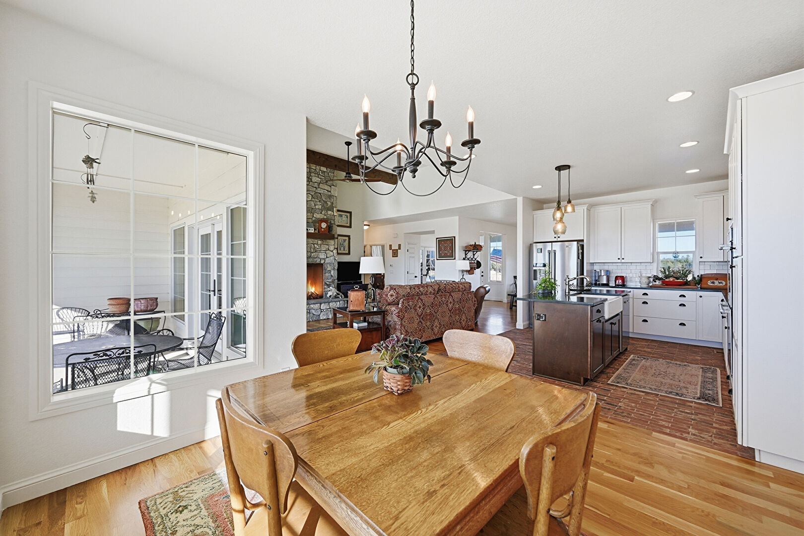 Baseboards Wall, Beamed Ceiling, Drywall, Fireplace, L Shaped Kitchen, Natural Light, Notable Chandelier, Vent, Wood Finish Floor, Natural Light, Notable Chandelier, Recessed Lighting, Wood Finish Floor