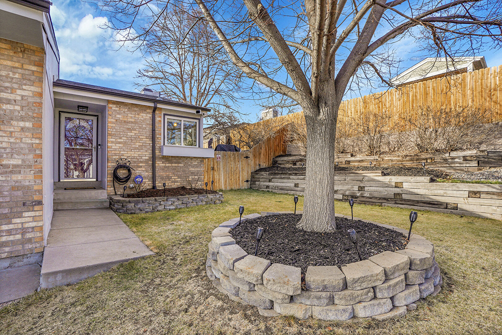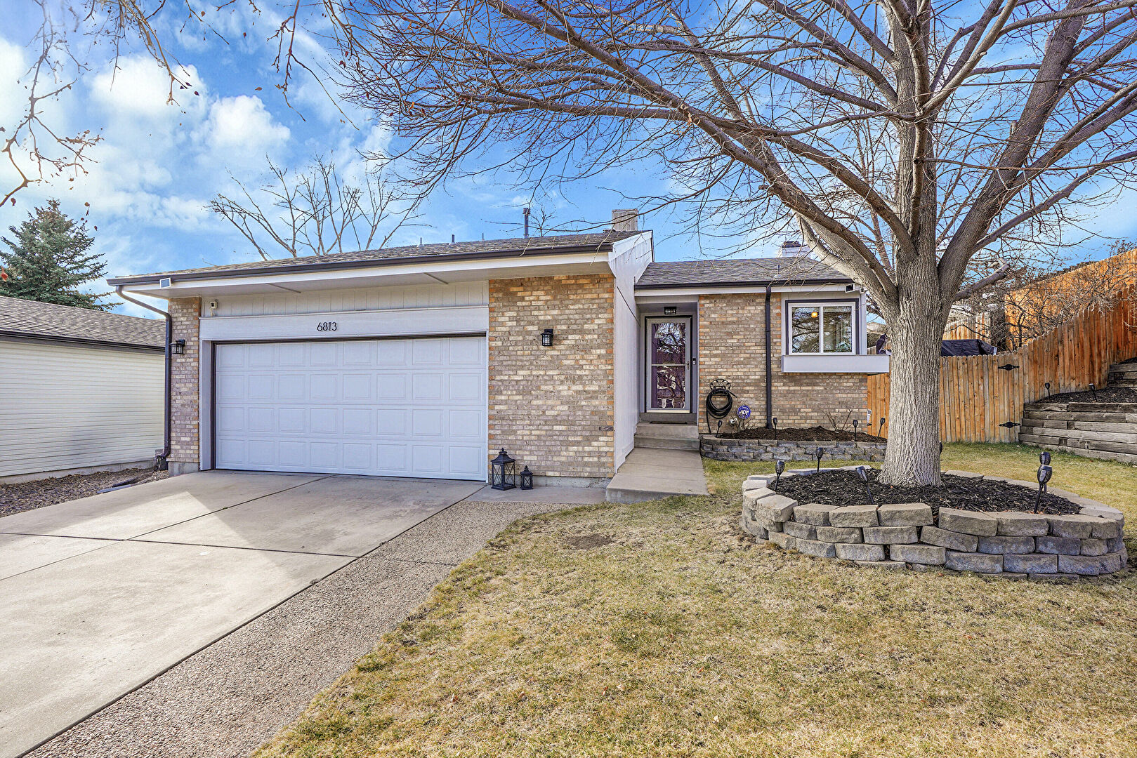 Brick Siding, Concrete Foundation, Downspout, Driveway, Fence, Gate, Gutters, Lawn, Shingle Roof, Stoop, Driveway, Fence