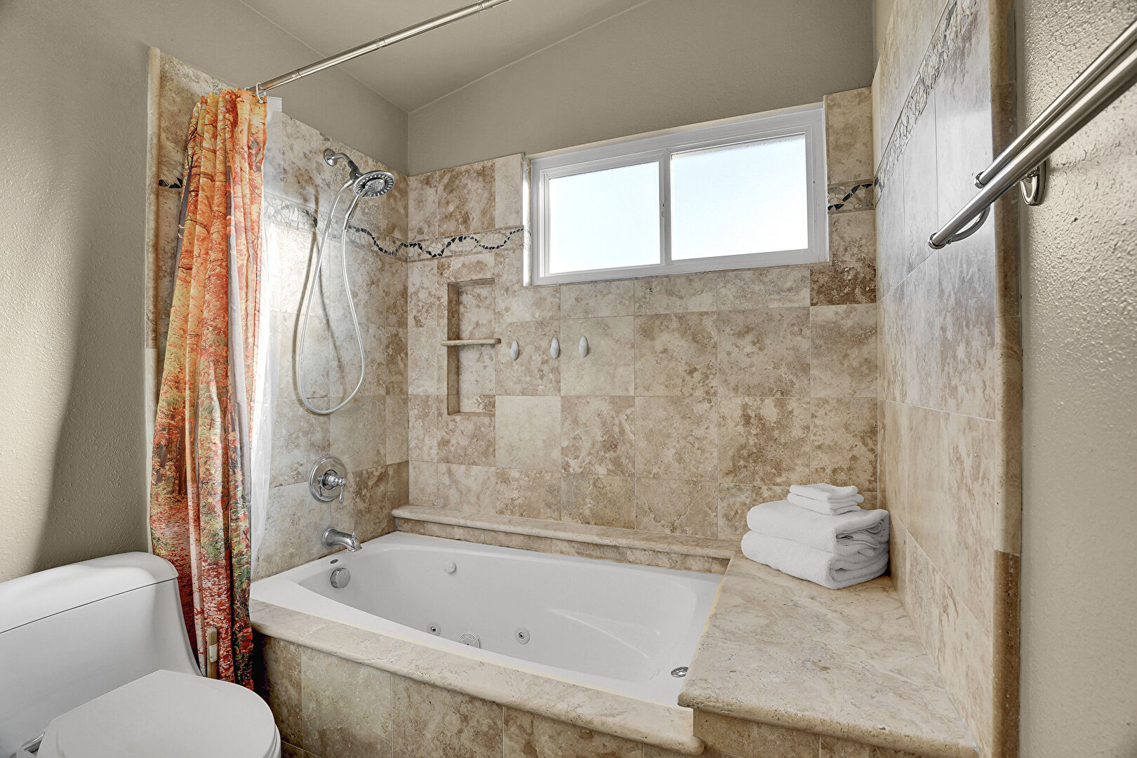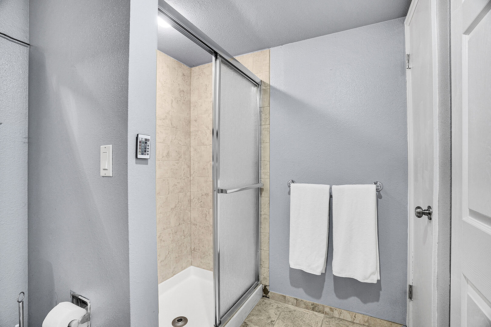 Baseboards Wall, Closet, Combined Bath Shower, Full Bathroom, Natural Light, Recessed Lighting, Textured Ceiling, Textured Wall, Vanity, Vaulted Ceiling, Vent, Drywall, Full Bathroom, Stone Finish Floor, Tile Floor