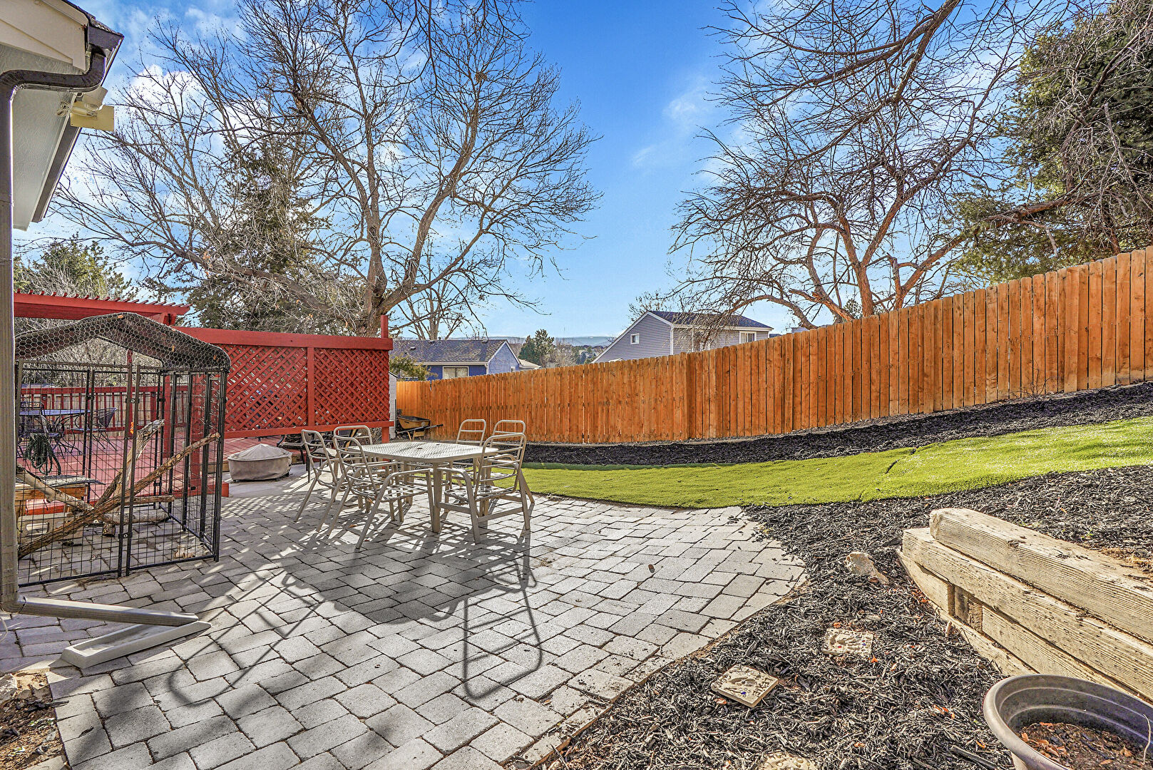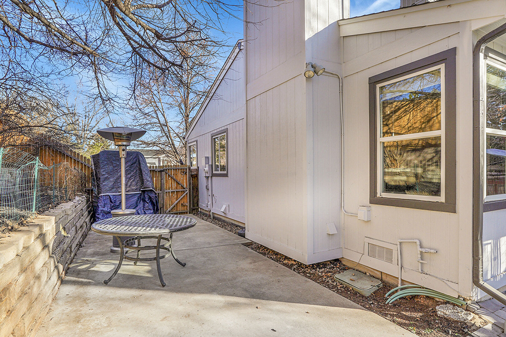 Fence, Fire Pit, Gate, Outdoor Dining Area, Patio, Deck, Lawn, Water Meter