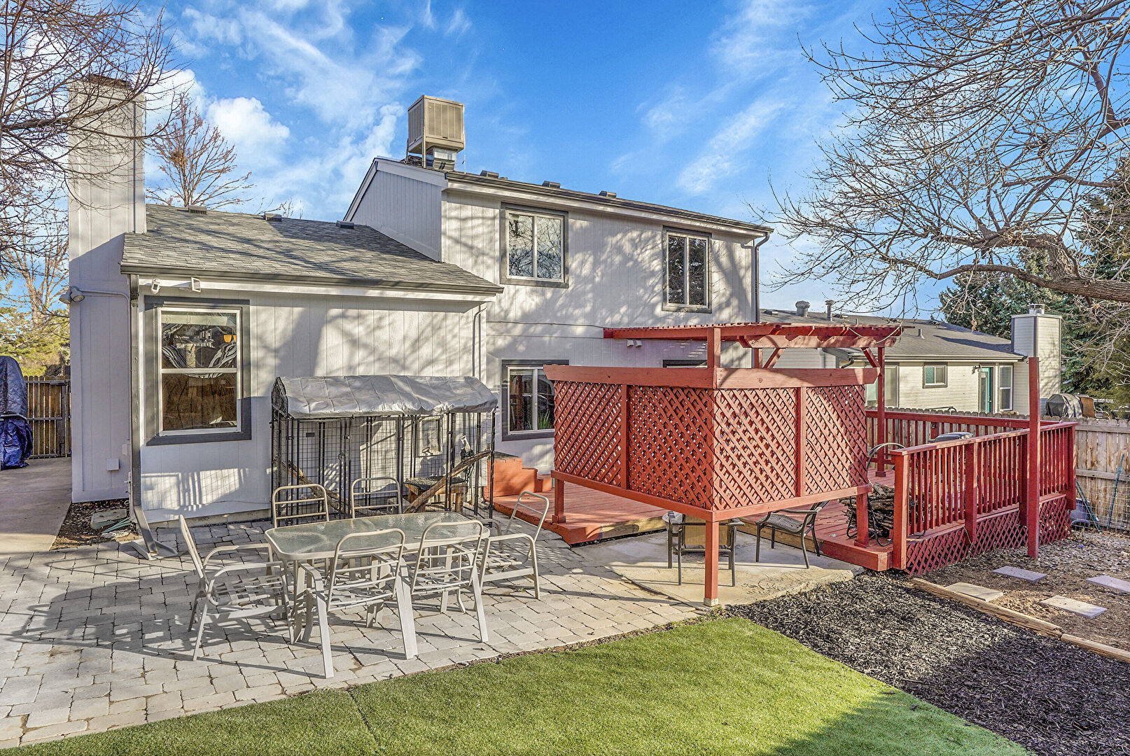 Central Ac, Chimney, Downspout, Fence, Gutters, Lawn, Outdoor Dining Area, Outdoor Structure, Patio, Shed, Shingle Roof, Stucco Siding, Vertical Siding, Deck, Fence