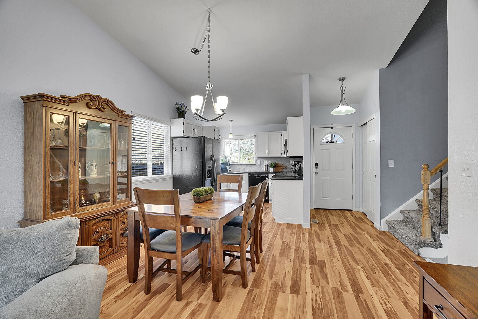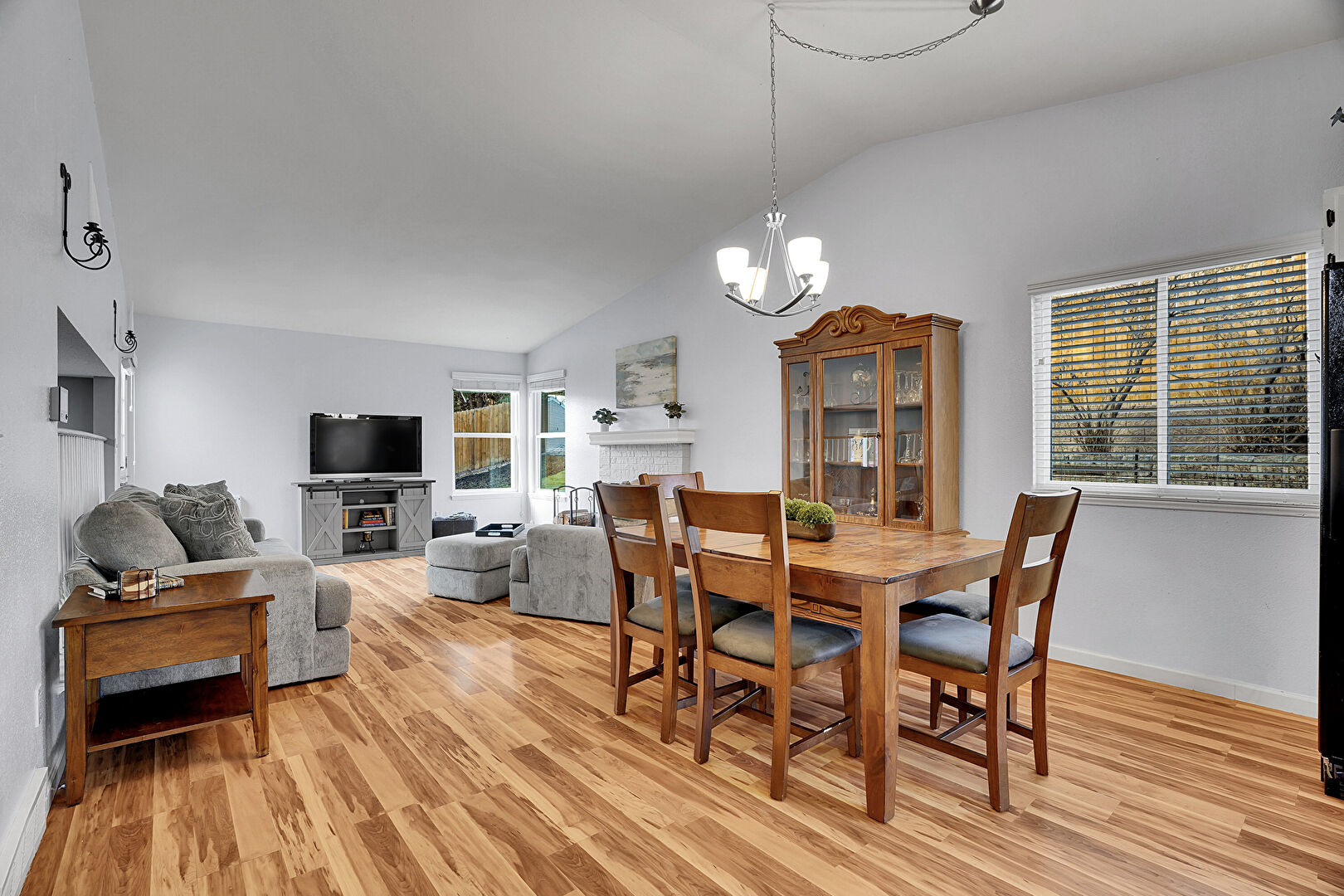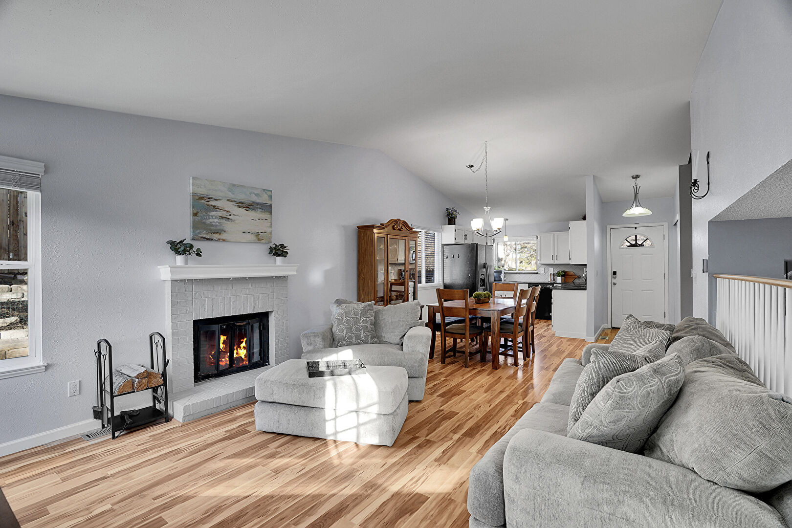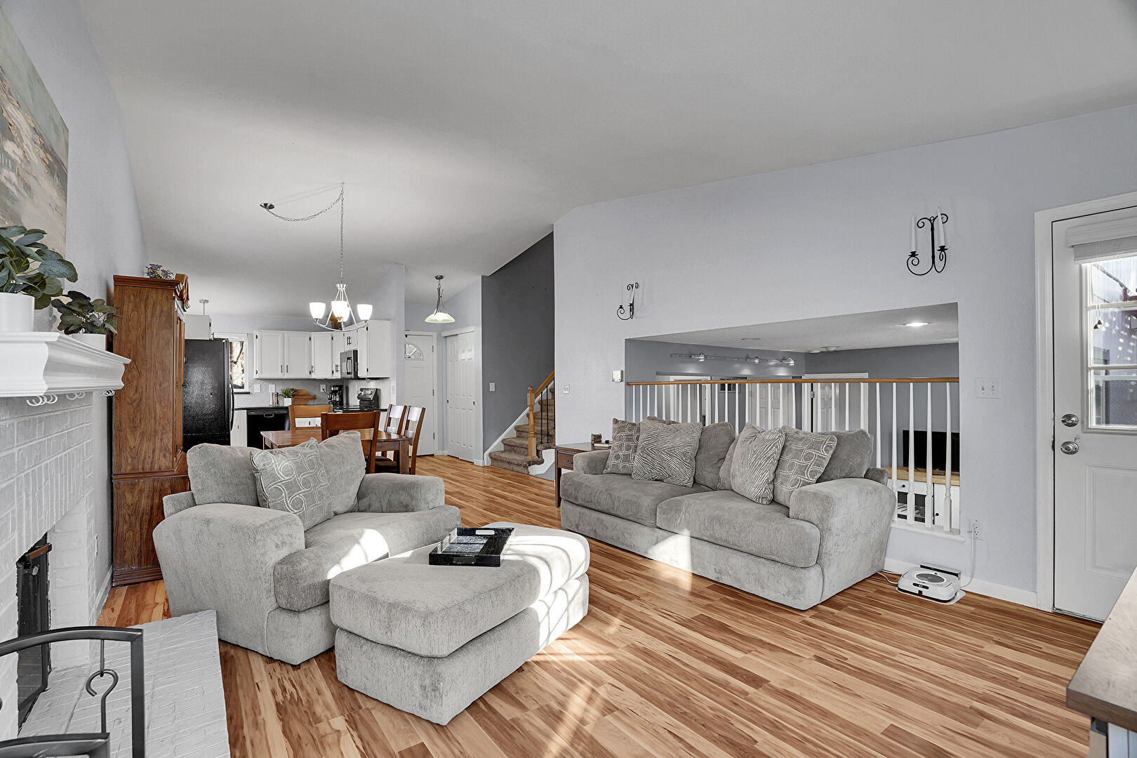 Baseboards Wall, Drywall, Fireplace, L Shaped Kitchen, Natural Light, Notable Chandelier, Textured Ceiling, Vaulted Ceiling, Wood Finish Floor, Fireplace, Natural Light, Stairs
