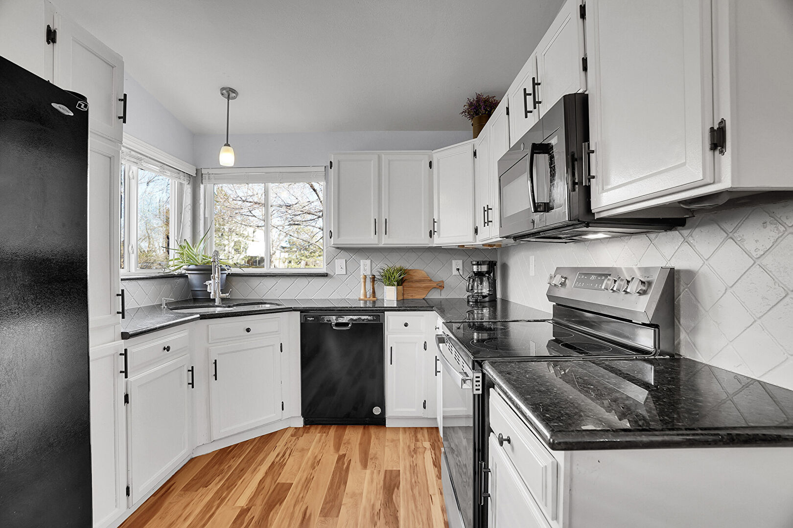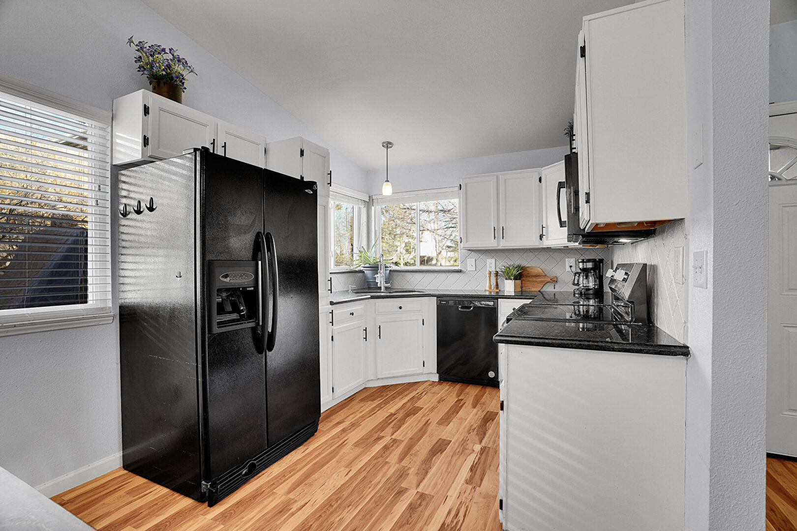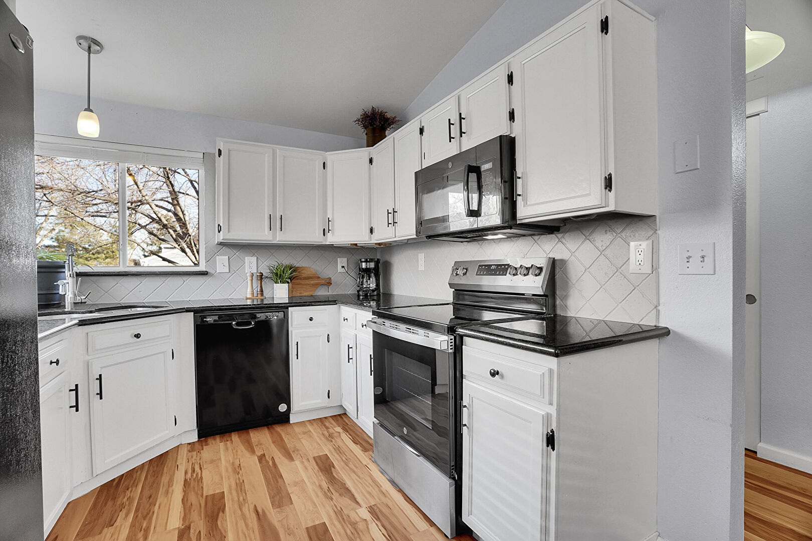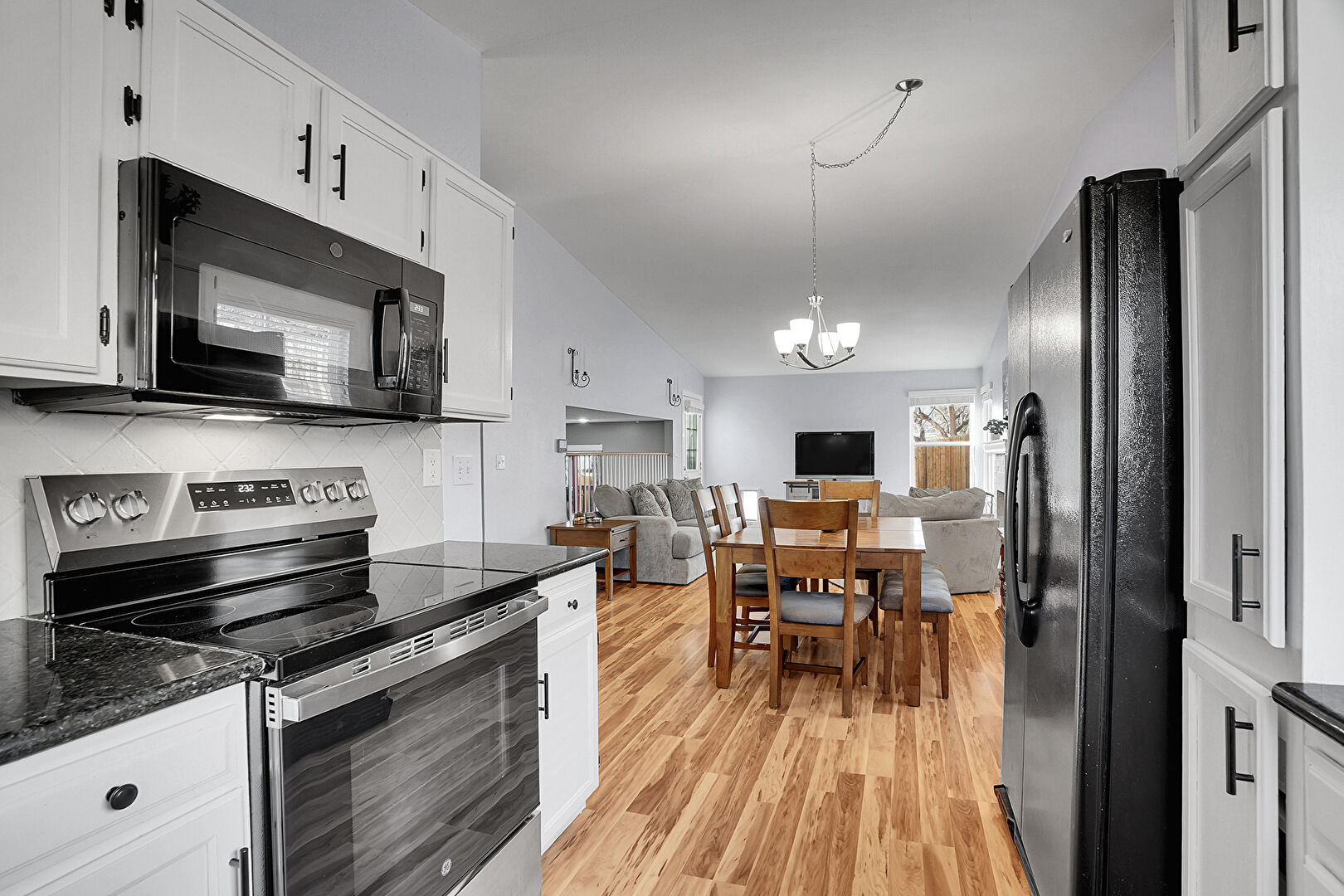 Drywall, Natural Light, Notable Chandelier, Opens To Living Area, Pendant Lighting, Shaker Cabinets, Stone Countertops, U Shaped Kitchen, Vaulted Ceiling, Visible Hinge Cabinets, Wood Finish Floor, Baseboards Wall, Drywall, Stone Countertops, Vaulted Ceiling
