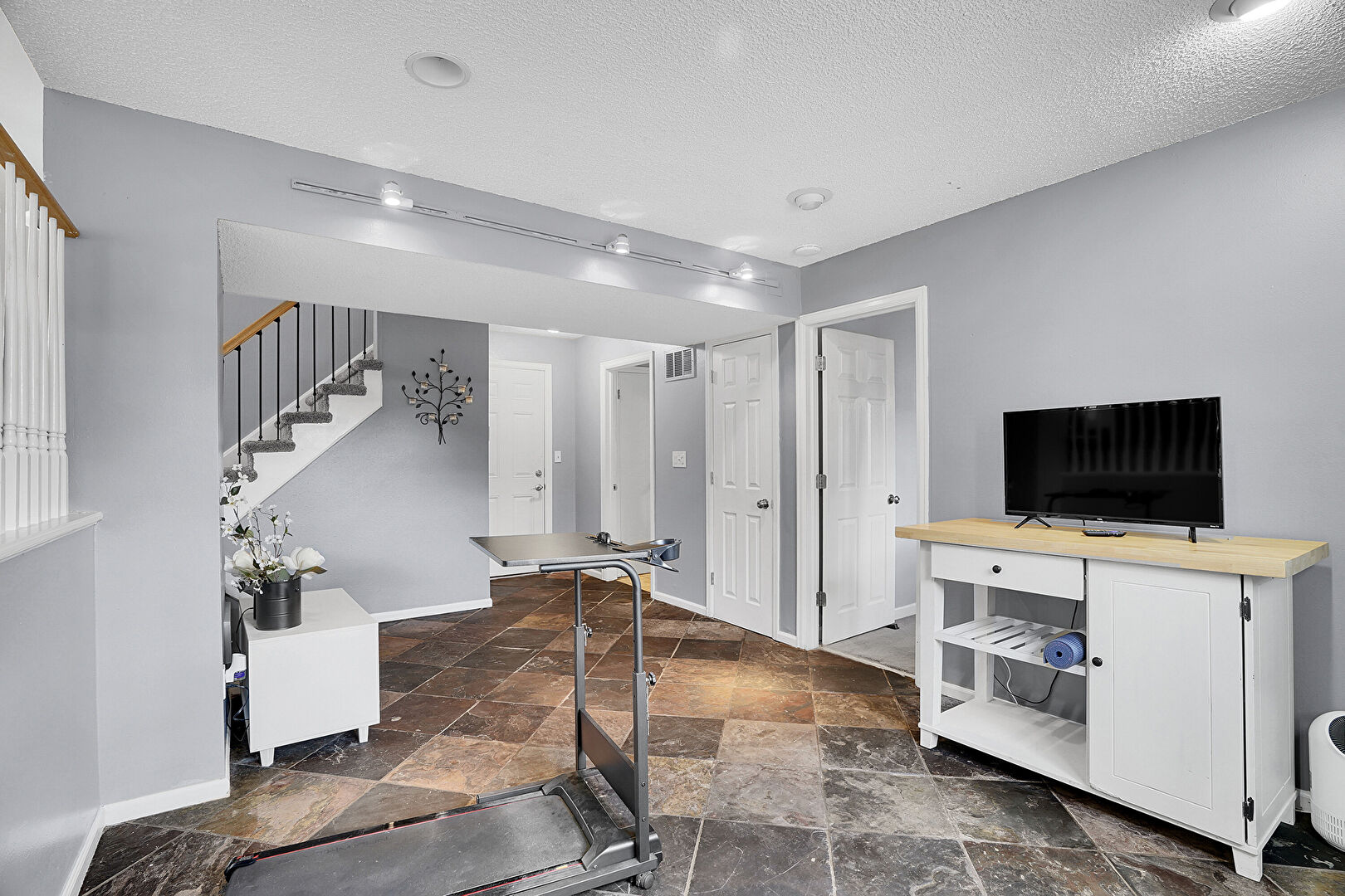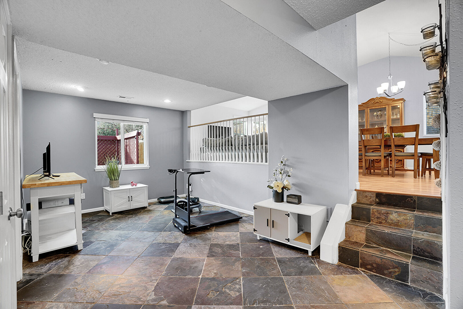 Baseboards Wall, Drywall, Natural Light, Notable Chandelier, Recessed Lighting, Stone Finish Floor, Textured Ceiling, Textured Ceiling, Vent