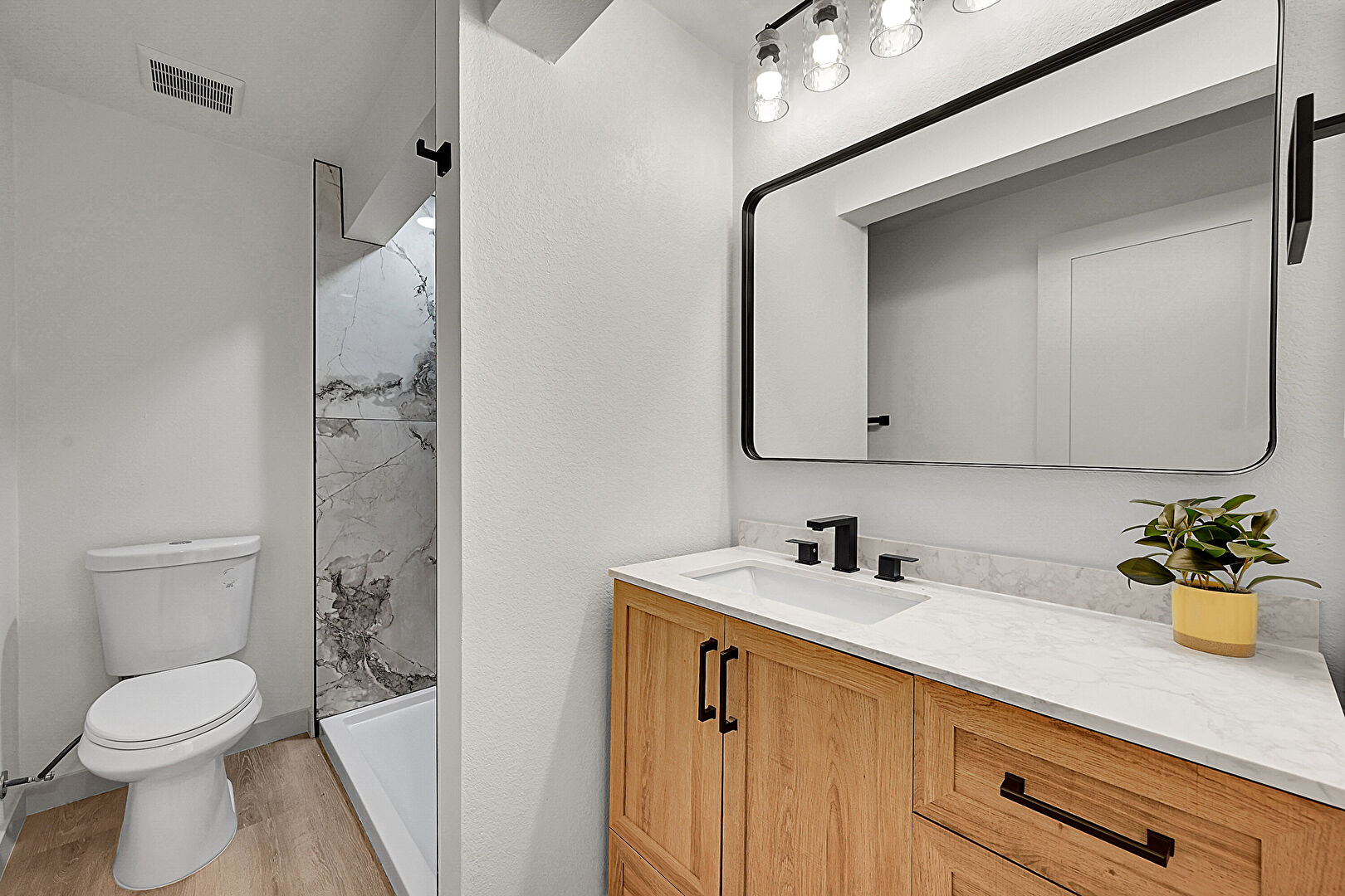 Baseboards Wall, Combined Bath Shower, Drywall, Full Bathroom, Natural Light, Vanity, Vent, Wood Finish Floor, Full Bathroom, Recessed Lighting