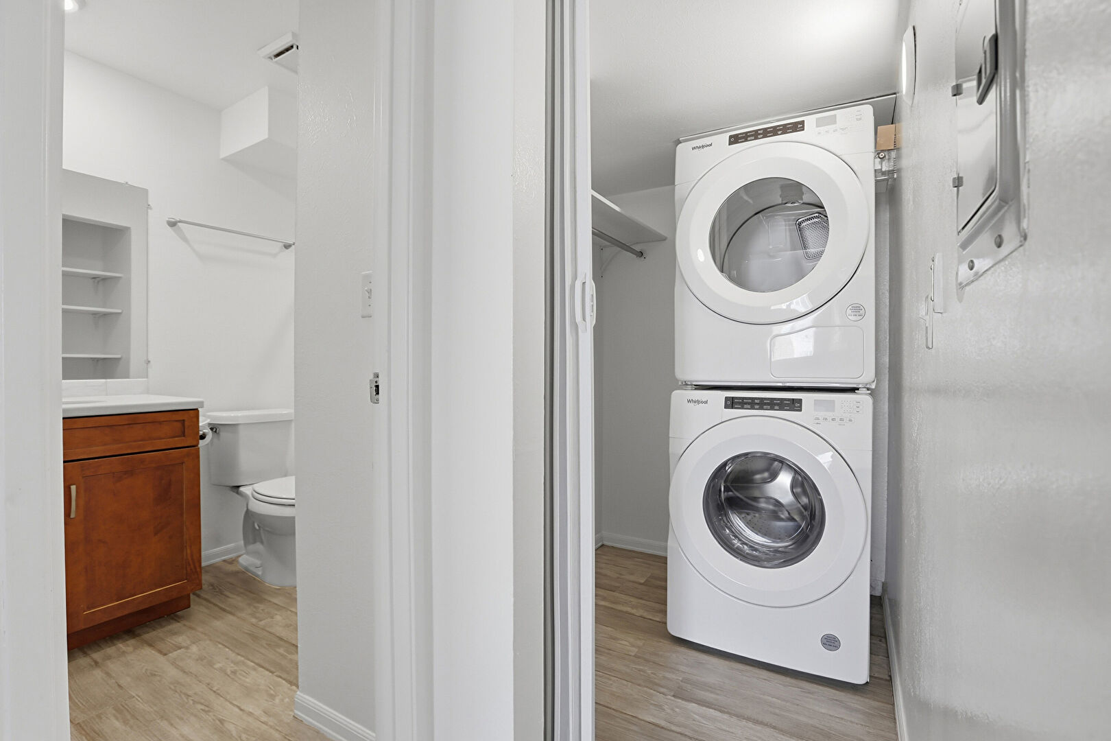 Built In Shelves, Drywall, Laundry, Vent, Wood Finish Floor, Baseboards Wall