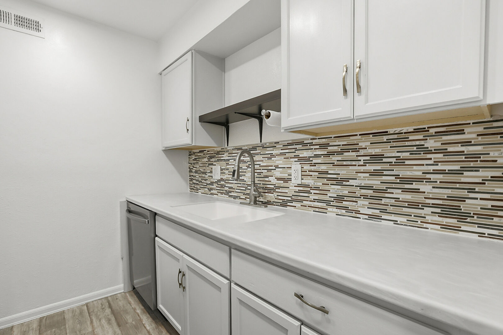 Baseboards Wall, Drywall, Open Shelves, Shaker Cabinets, Vent, Wood Finish Floor, Recessed Lighting, Shaker Cabinets, Vent