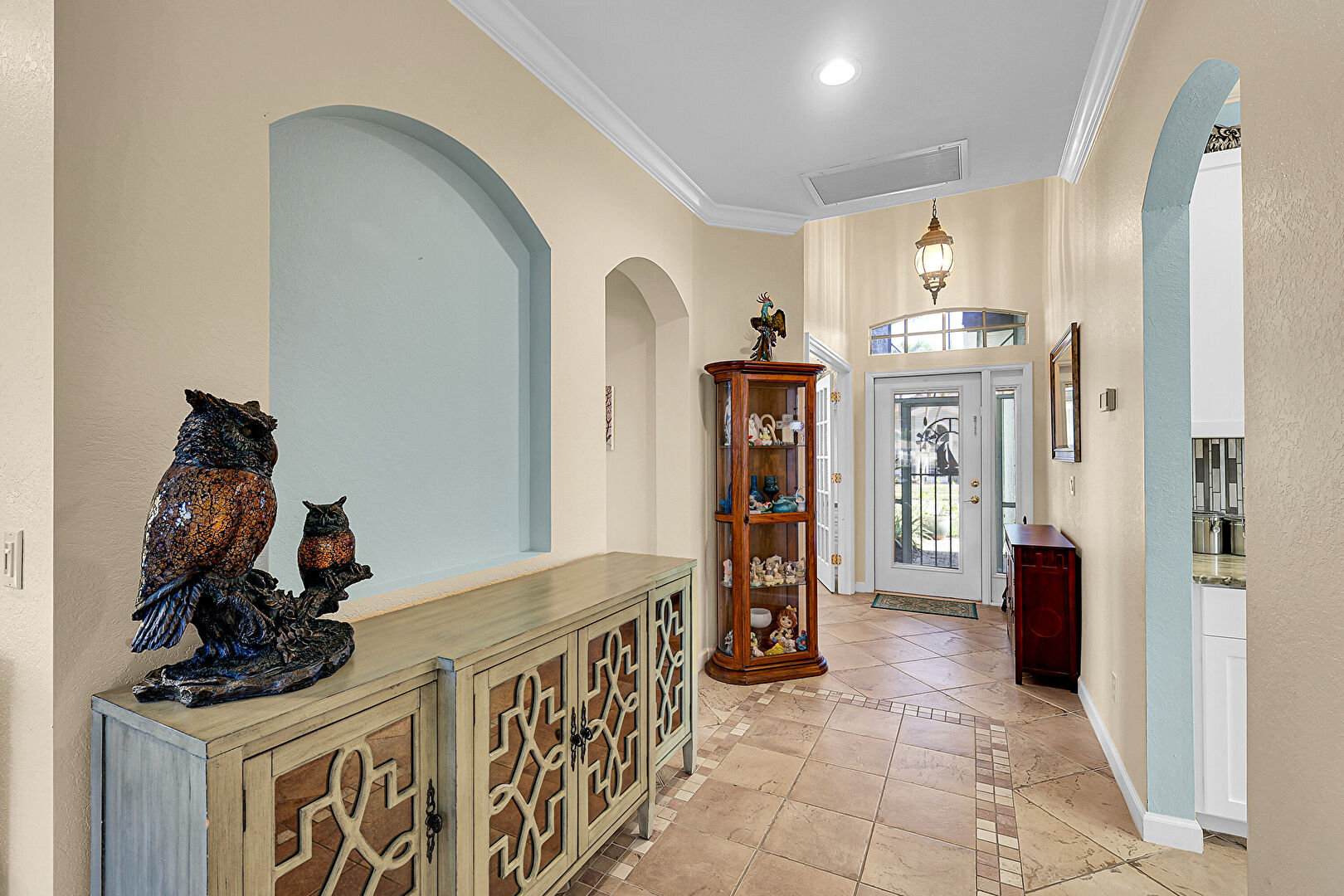 Arched Walkways, Baseboards Wall, Crown Molding, Drywall, Natural Light, Tile Floor, Inlaid Floor