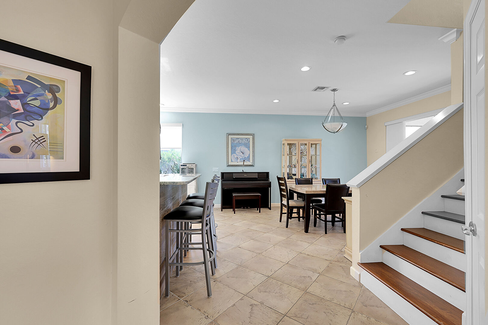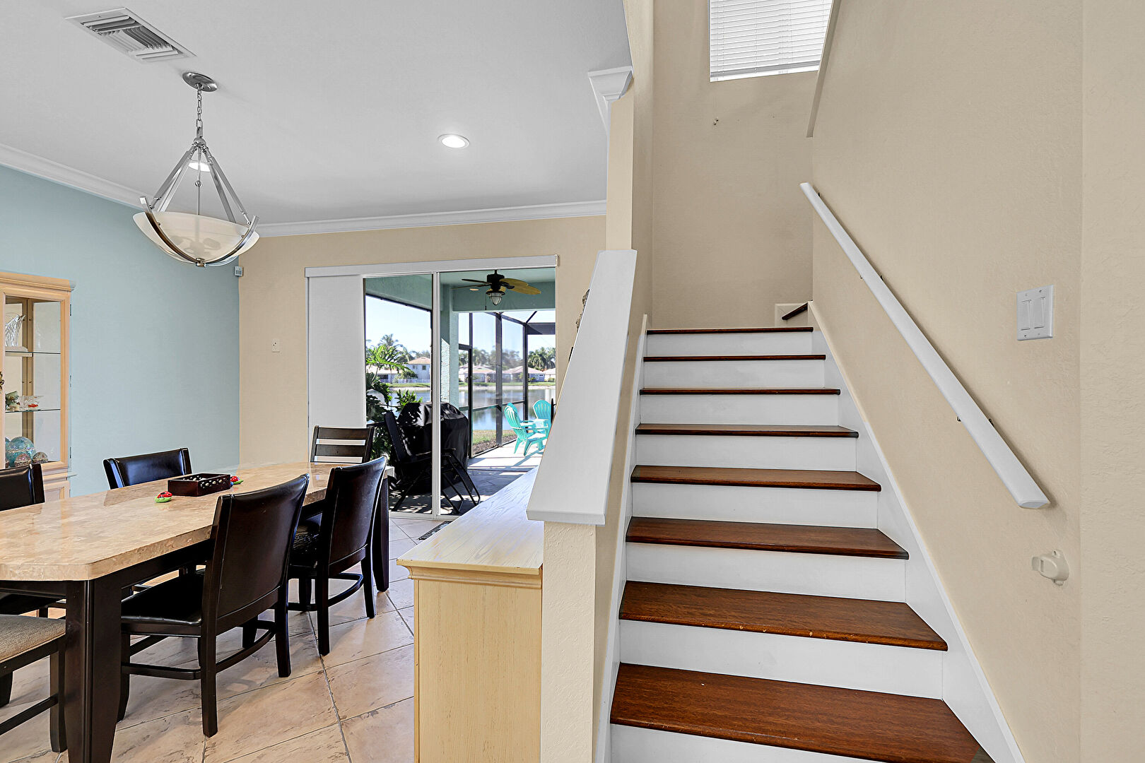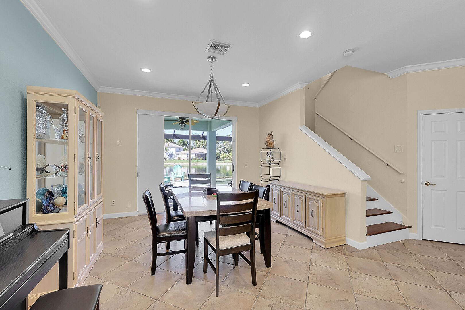 Arched Walkways, Baseboards Wall, Ceiling Fan, Crown Molding, Drywall, Natural Light, Recessed Lighting, Stairs, Sunroom, Tile Floor, U Shaped Kitchen, Vent, Water View, Waterfront, Baseboards Wall, Natural Light, Recessed Lighting, Vent