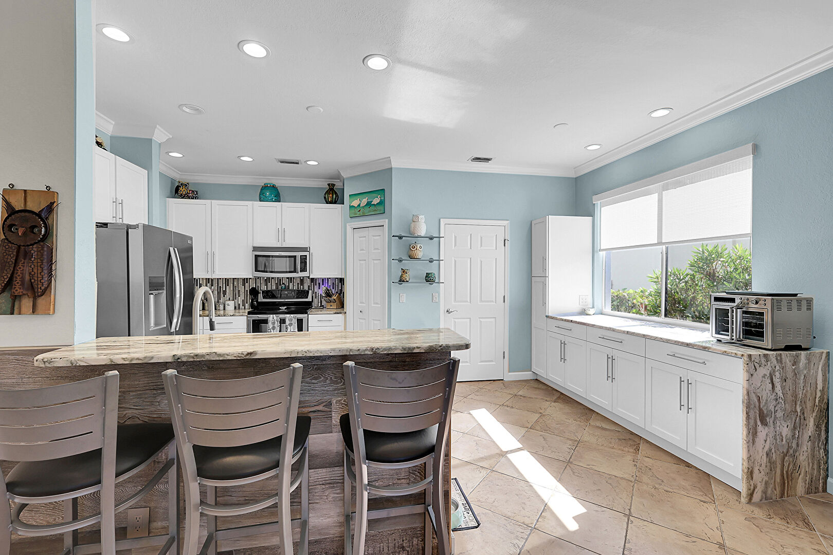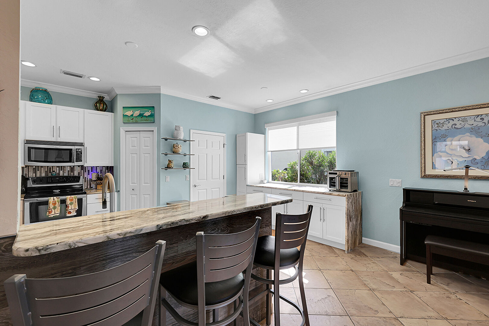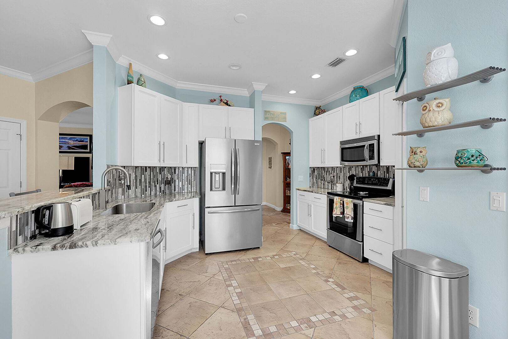 Arched Walkways, Baseboards Wall, Crown Molding, Drywall, G Shaped Kitchen, Inlaid Floor, Kitchen Bar, Kitchen Peninsula, Natural Light, Open Shelves, Pendant Lighting, Recessed Lighting, Shaker Cabinets, Stone Countertops, Tile Floor, Toaster, U Shaped Kitchen, Vent, Arched Walkways, Crown Molding, Natural Light, Recessed Lighting, Stone Countertops