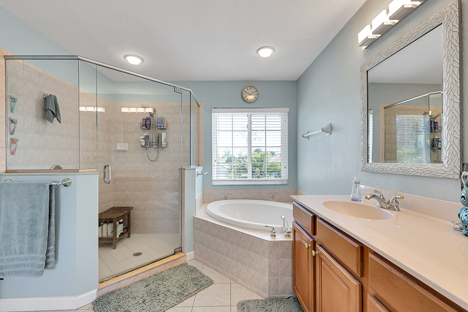 Combined Bath Shower, Double Vanity, Drywall, Ensuite Bathroom, Full Bathroom, Natural Light, Recessed Lighting, Tile Floor, Vanity, Drywall, Full Bathroom, Vanity, Vent