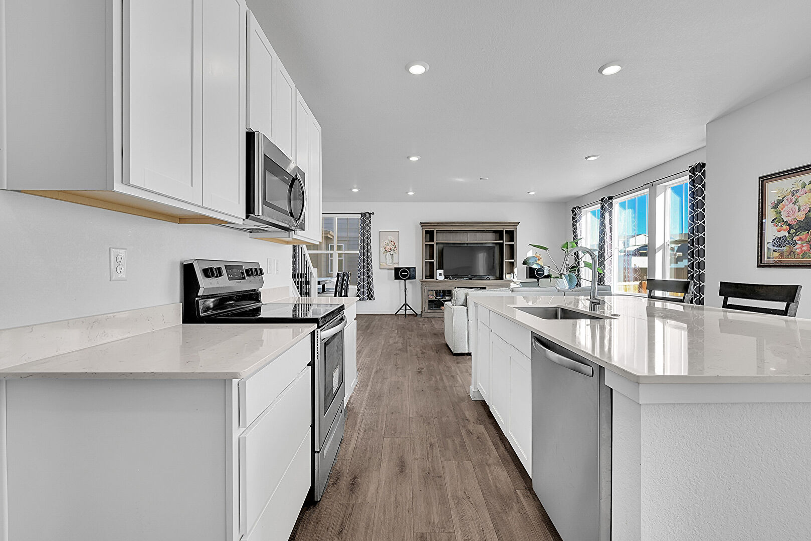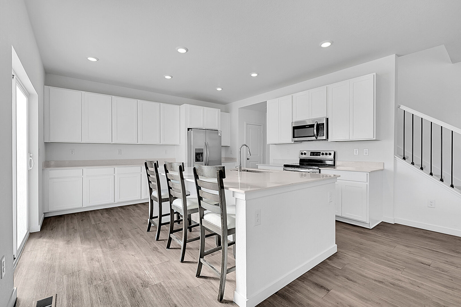 Baseboards Wall, Drywall, Kitchen Bar, Kitchen Island, L Shaped Kitchen, Natural Light, Opens To Living Area, Recessed Lighting, Shaker Cabinets, Stone Countertops, Vent, Wood Finish Floor, Recessed Lighting, Stone Countertops