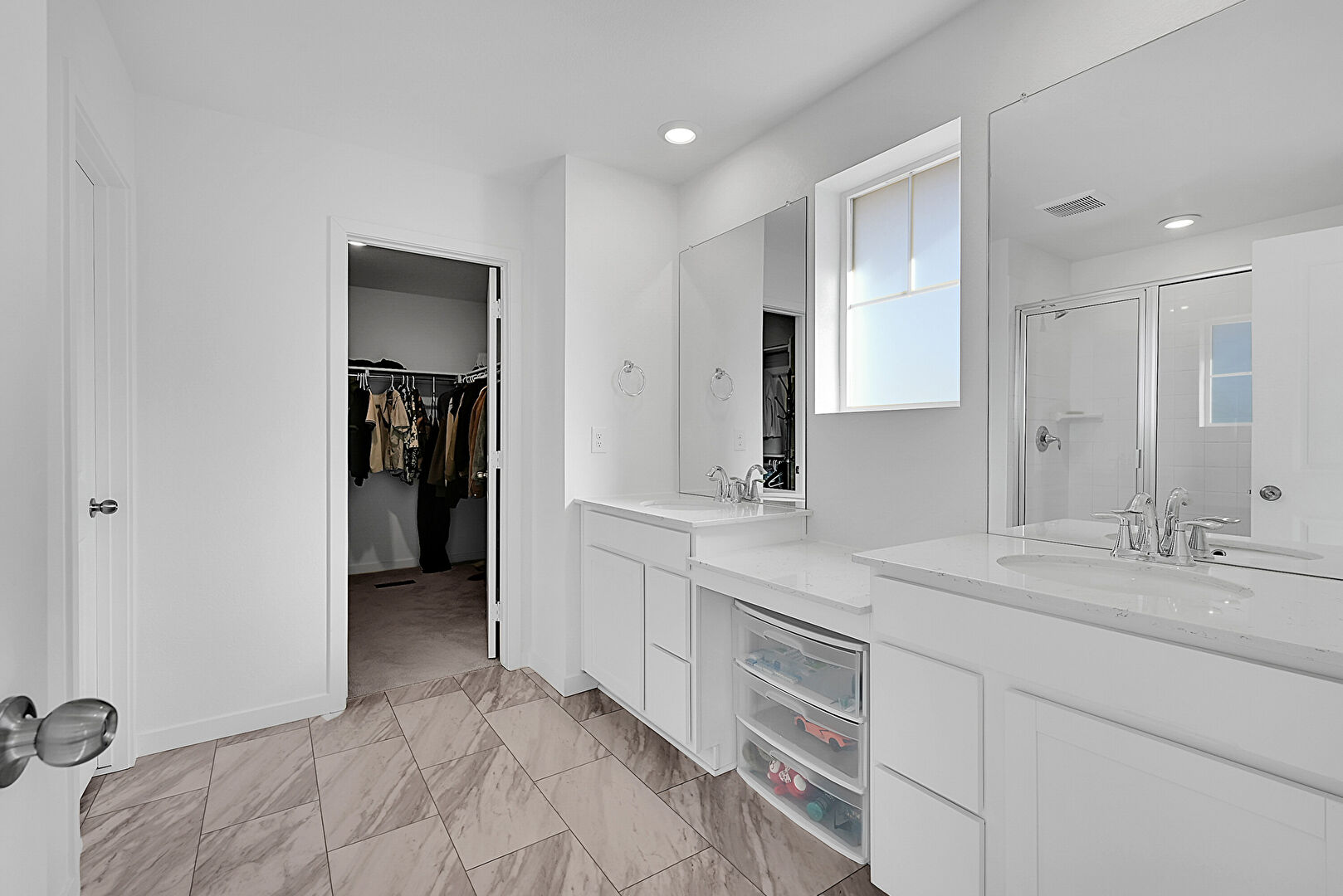 Baseboards Wall, Double Vanity, Drywall, Full Bathroom, Marble Finish Floor, Natural Light, Recessed Lighting, Two Single Vanities, Vent, Walk In Closet, Ensuite Bathroom, Full Bathroom