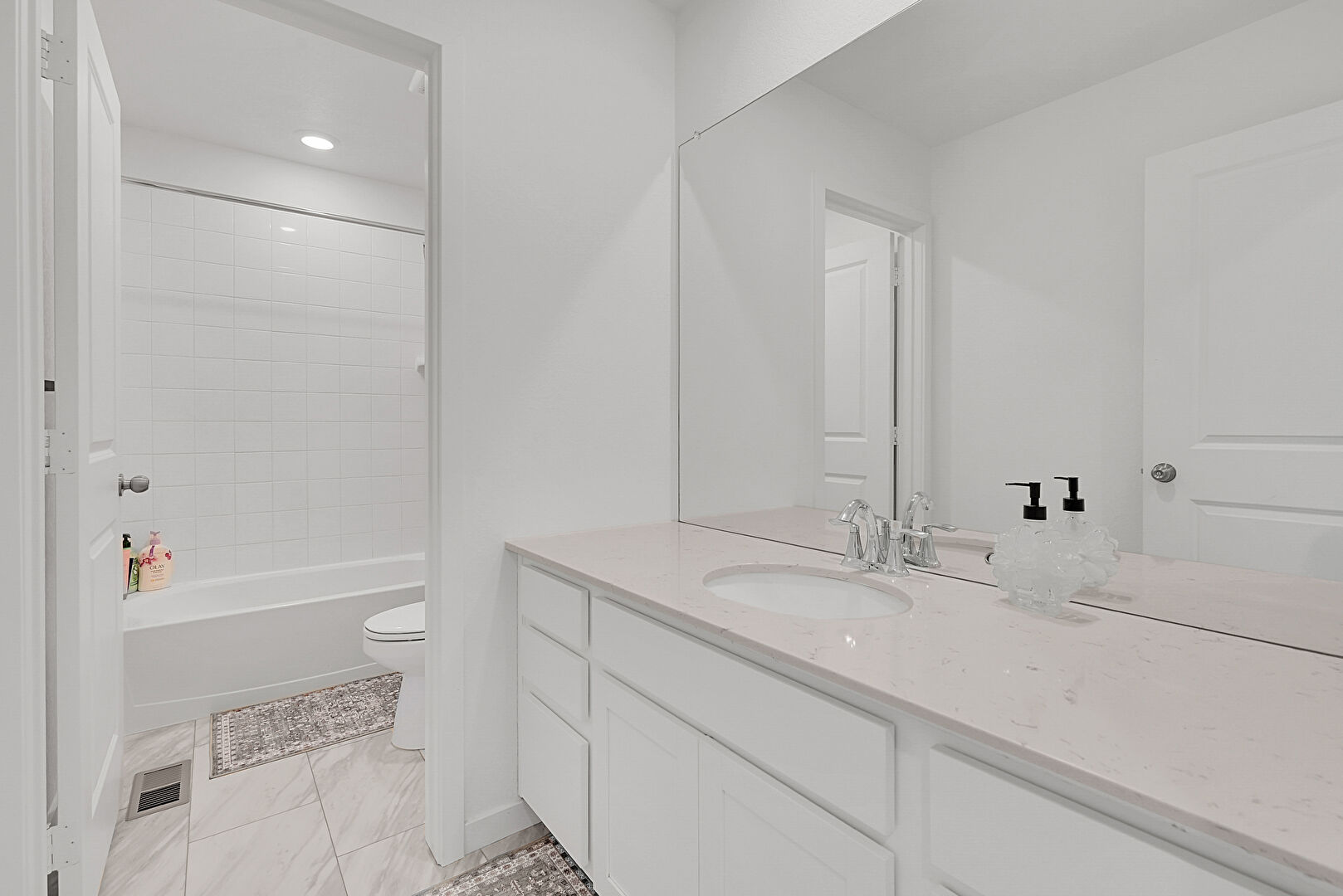 Combined Bath Shower, Drywall, Full Bathroom, Marble Finish Floor, Recessed Lighting, Vent, Vanity