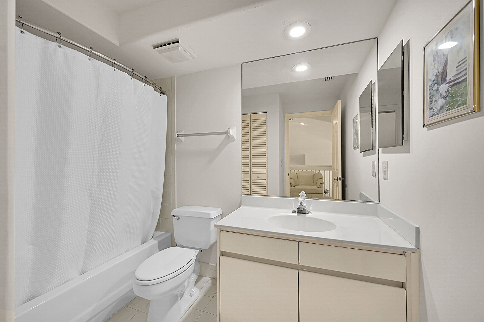 Closet, Combined Bath Shower, Full Bathroom, Recessed Lighting, Tile Floor, Vanity, Vent, Drywall