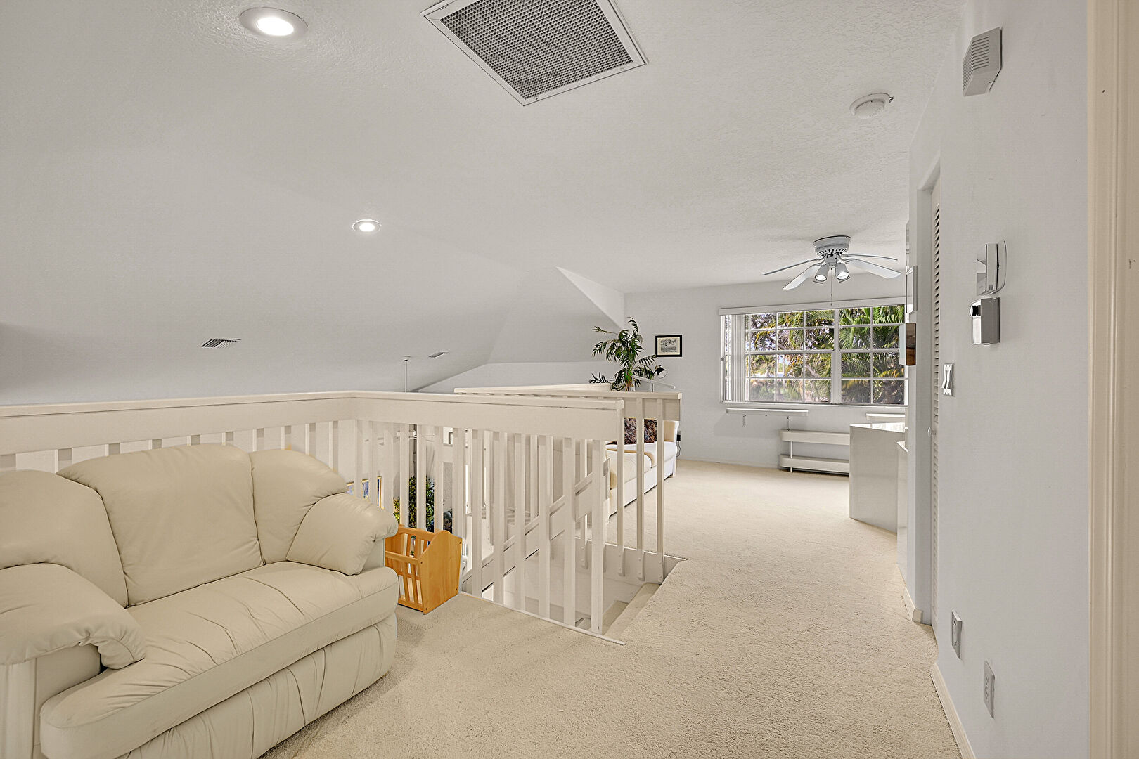 Baseboards Wall, Carpet, Ceiling Fan, Drywall, Loft, Natural Light, Office Area, Recessed Lighting, Vaulted Ceiling, Vent, Textured Ceiling, Upstairs Landing