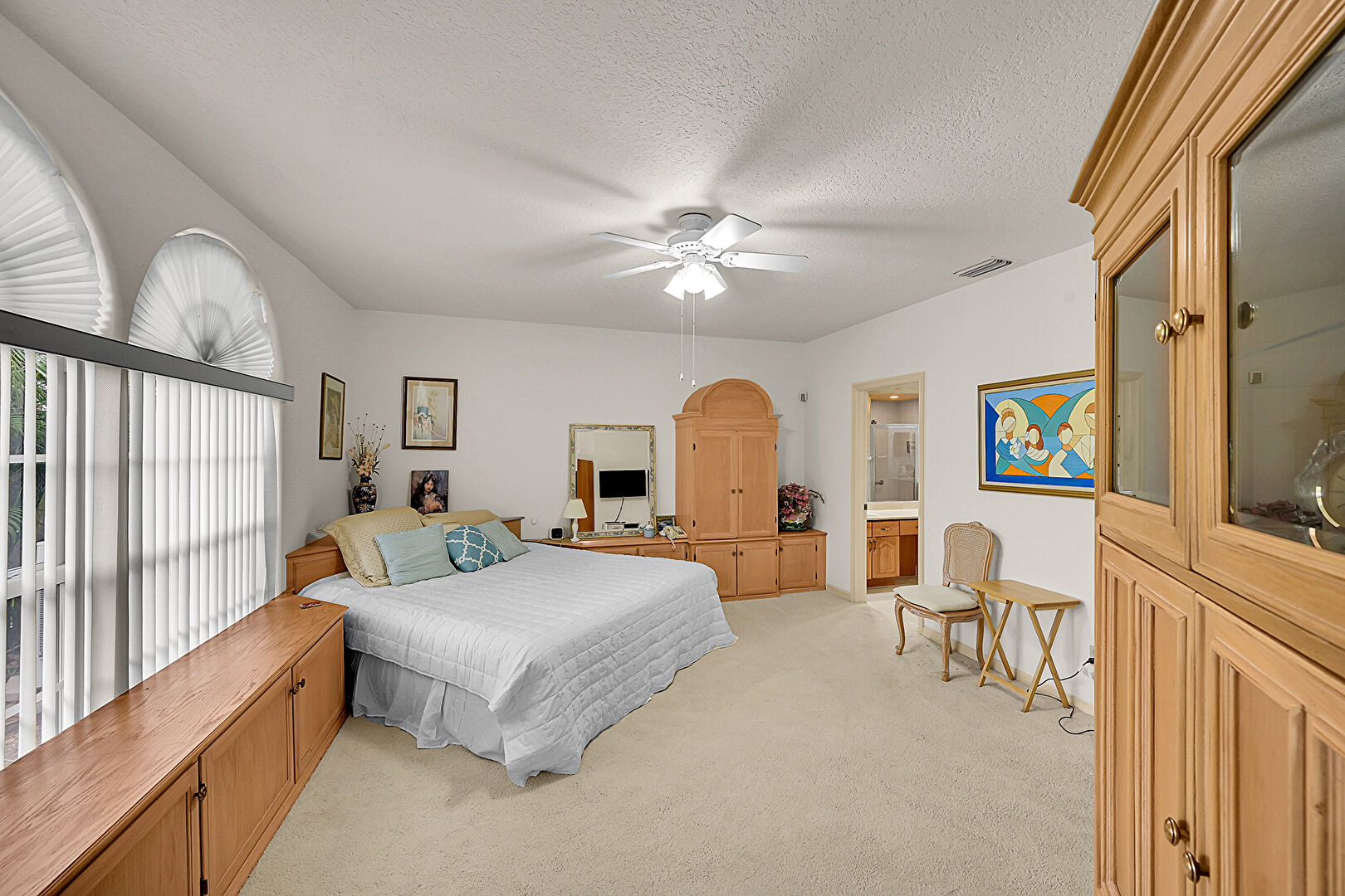 Carpet, Ceiling Fan, Drywall, Ensuite Bathroom, Natural Light, Textured Ceiling, Vent, Ceiling Fan, Textured Ceiling