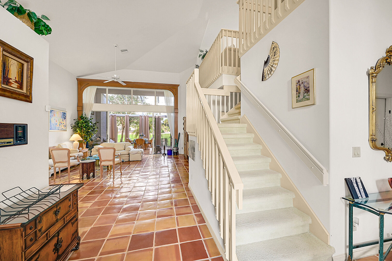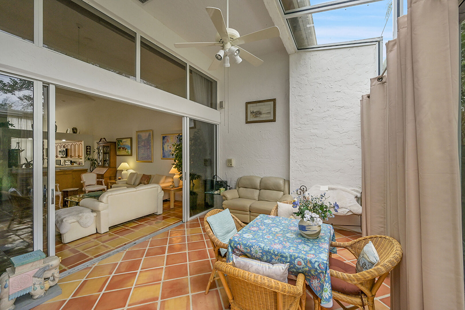 Ceiling Fan, Drywall, High Ceiling, Natural Light, Tile Floor, Vaulted Ceiling, Vent, High Ceiling, Tile Floor