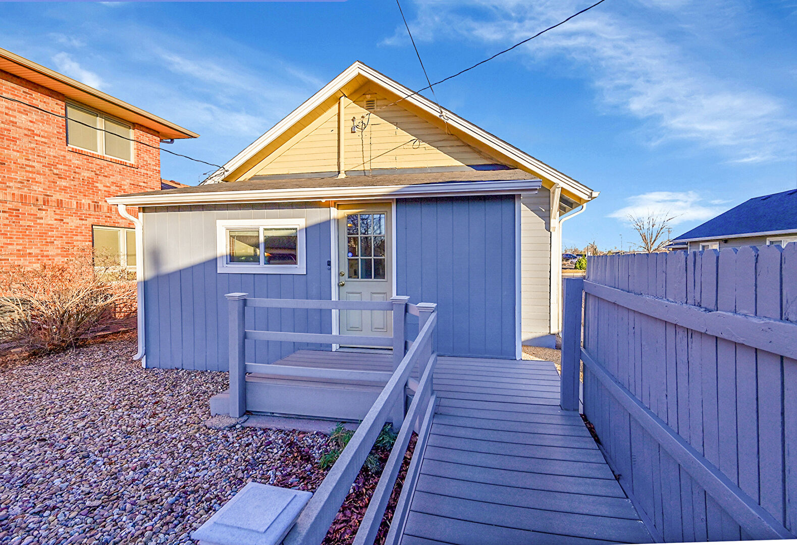Board Batten Siding, Deck, Downspout, Fence, Gutters, Horizontal Siding, Outdoor Structure, Street, Stucco Siding, Vertical Siding, Fence, Gutters, Residential View