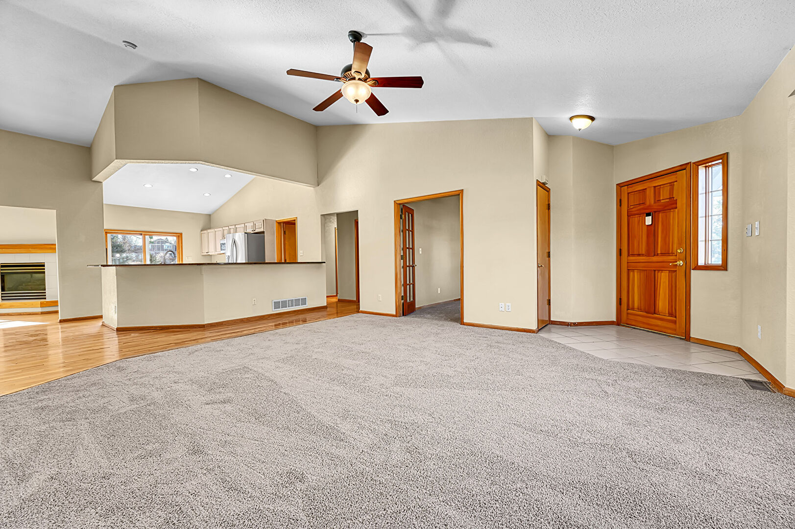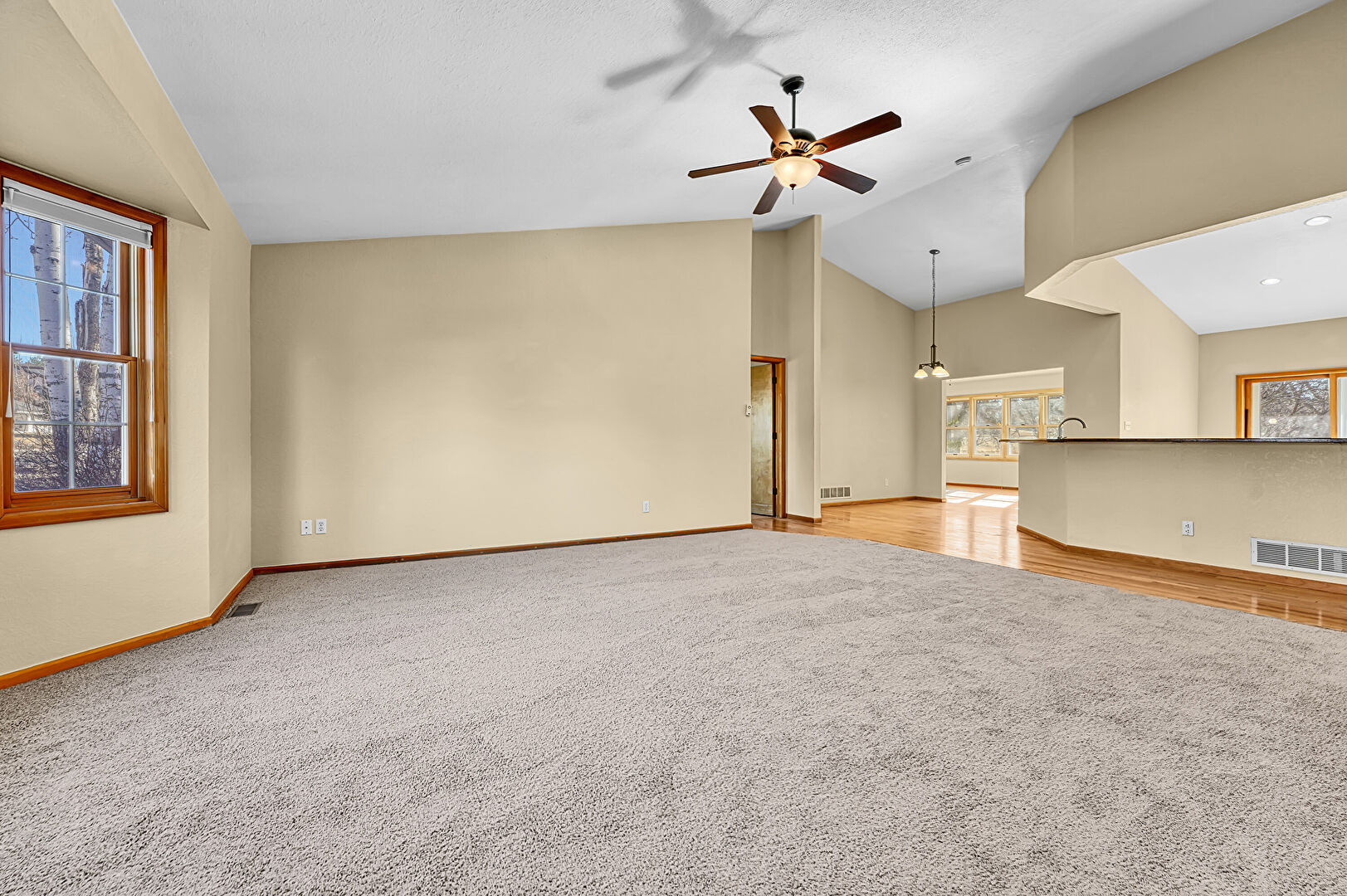 Baseboards Wall, Carpet, Ceiling Fan, Drywall, Fireplace, High Ceiling, Natural Light, Vaulted Ceiling, Vent, Cathedral Ceiling, Drywall, Vent