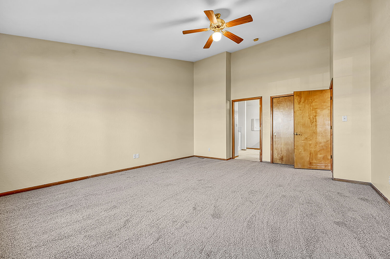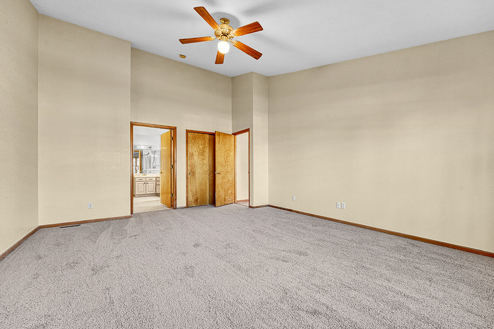 Baseboards Wall, Carpet, Ceiling Fan, Drywall, Ensuite Bathroom, High Ceiling, Natural Light, Vaulted Ceiling, Vent, Ceiling Fan, Drywall