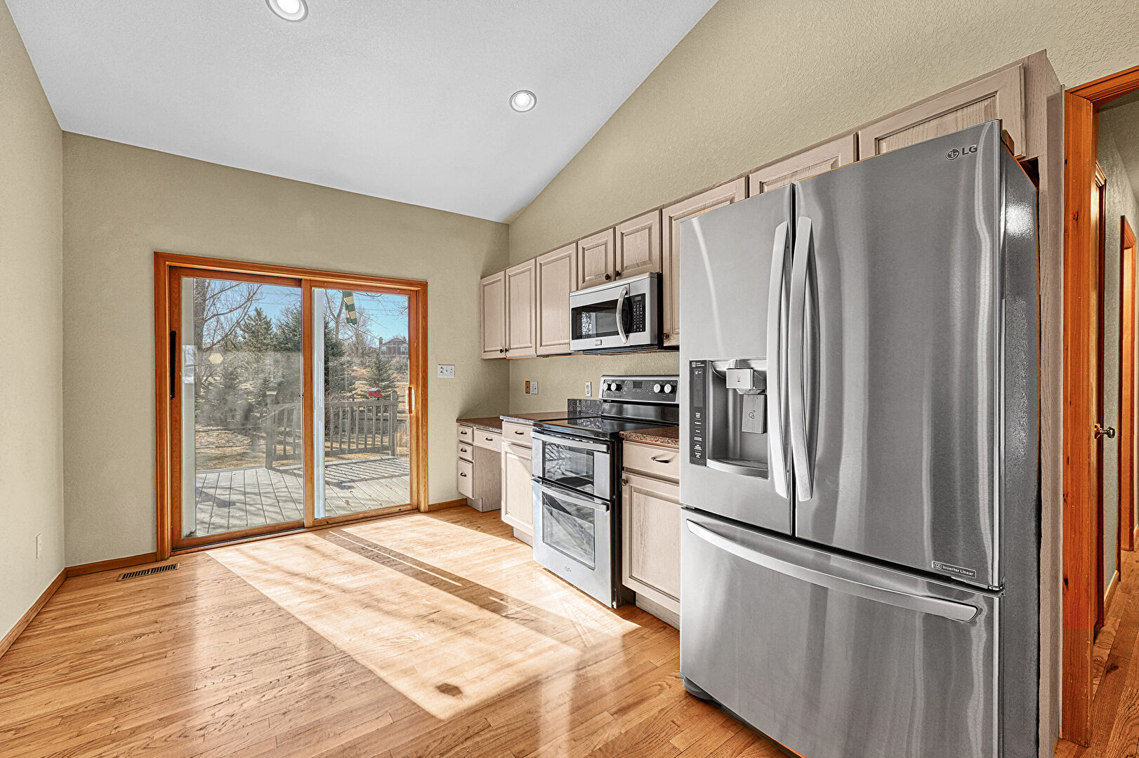 Baseboards Wall, Carpet, Drywall, Natural Light, Textured Ceiling, Vaulted Ceiling, Vent, Tile Floor