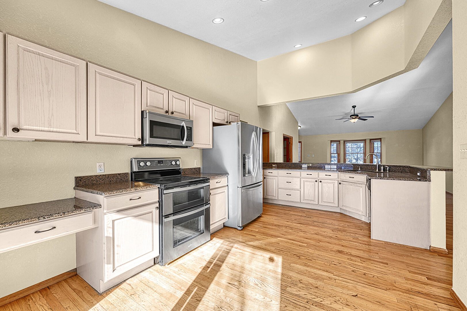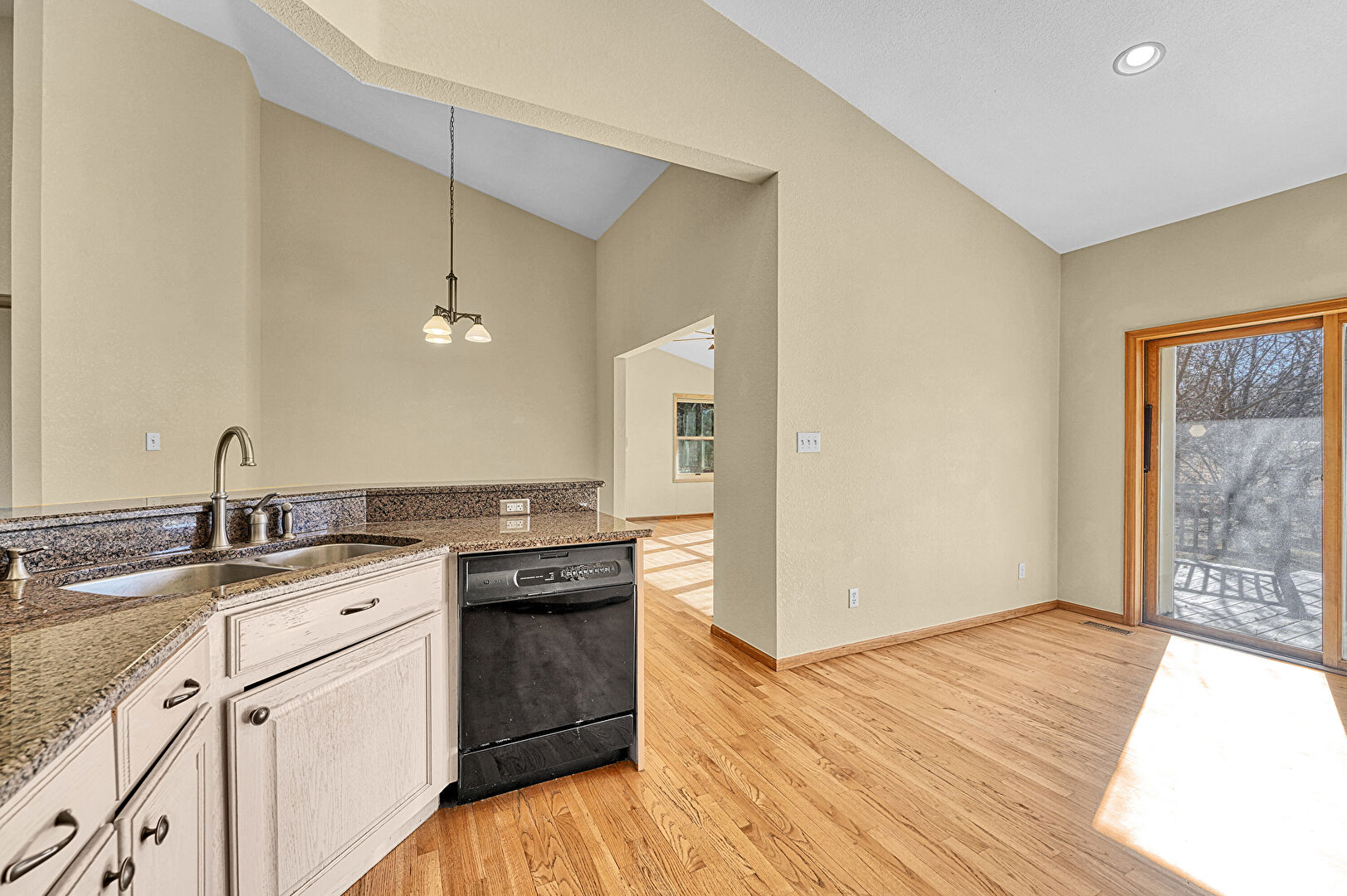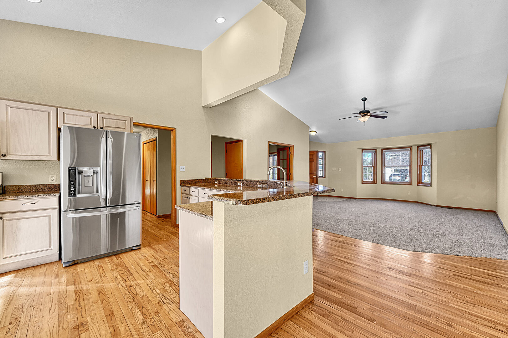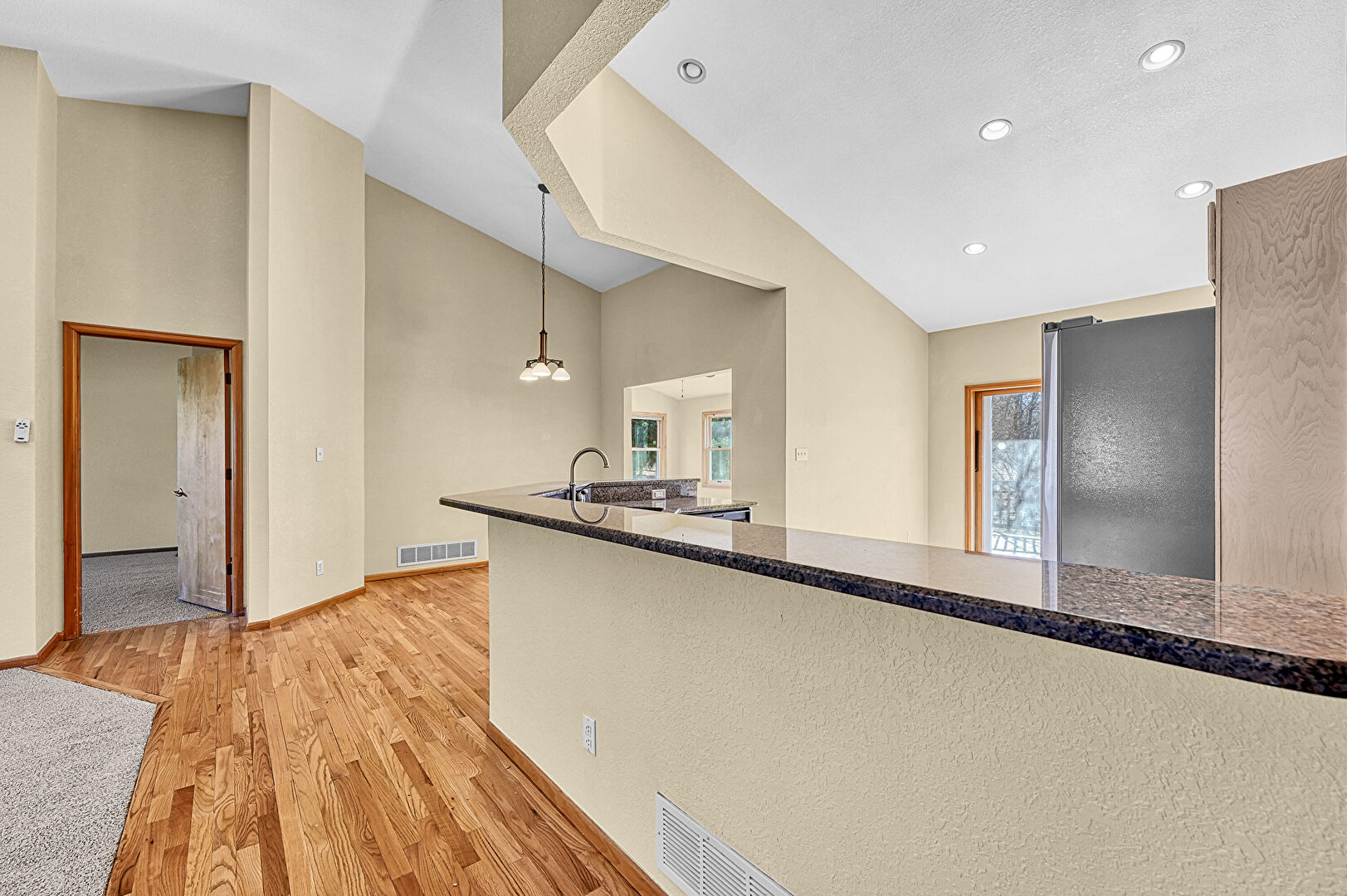 Arched Cabinets, Baseboards Wall, Basement, Butcher Block Countertops, Carpet, Ceiling Fan, Cream Cabinets, Drywall, High Ceiling, Kitchen Peninsula, Natural Light, Notable Chandelier, Pendant Lighting, Raised Cabinets, Recessed Lighting, Shaker Cabinets, Stone Countertops, Textured Ceiling, Vaulted Ceiling, Vent, Visible Hinge Cabinets, Wood Finish Floor, Baseboards Wall, High Ceiling, Natural Light, Opens To Living Area, Raised Cabinets, Shaker Cabinets