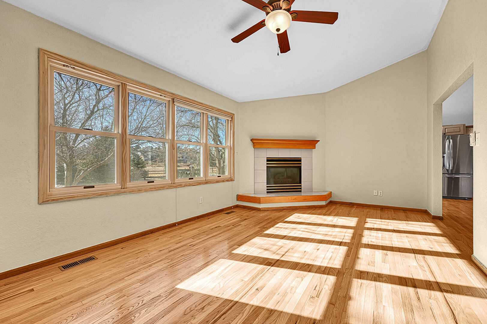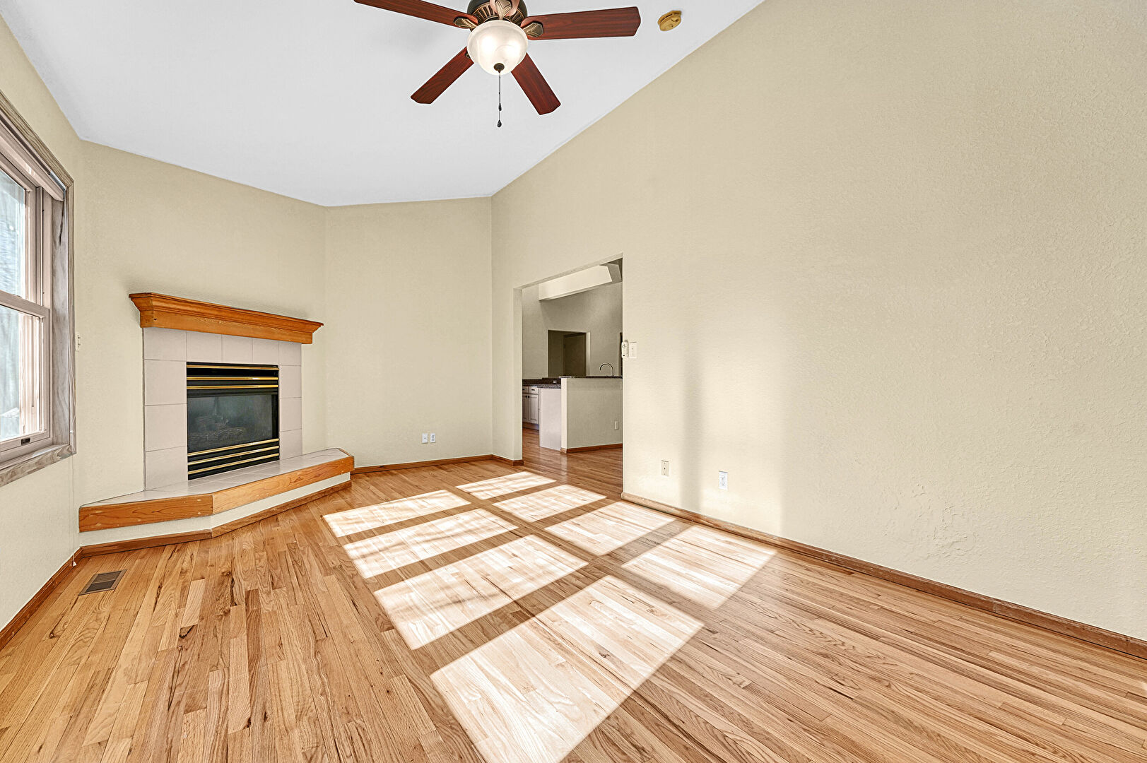 Baseboards Wall, Ceiling Fan, Drywall, Fireplace, High Ceiling, Natural Light, Vent, Wood Finish Floor, Vaulted Ceiling, Wood Finish Floor