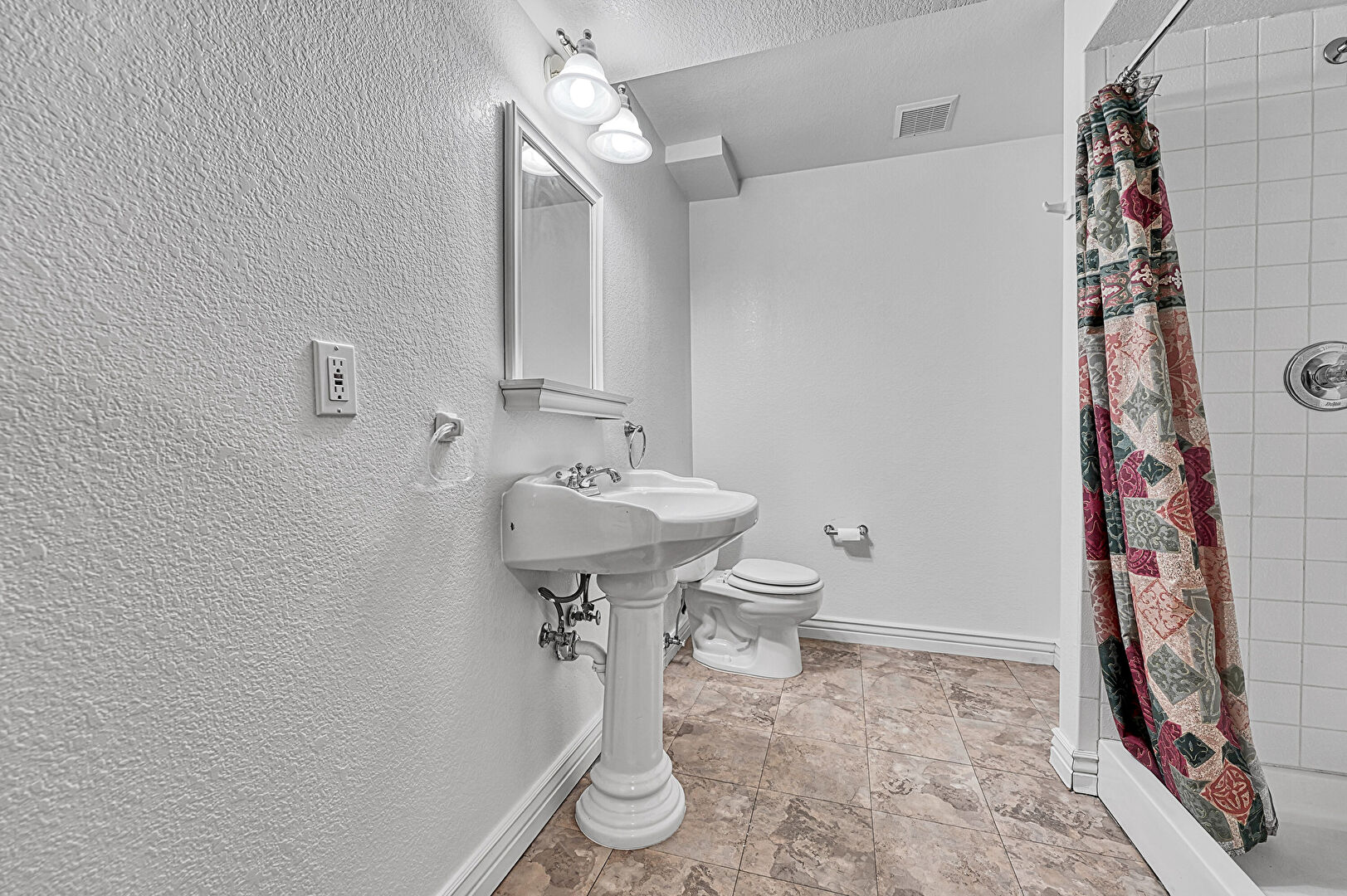 Combined Bath Shower, Drywall, Full Bathroom, Textured Ceiling, Textured Wall, Vanity, Vent, Baseboards Wall, Tile Floor