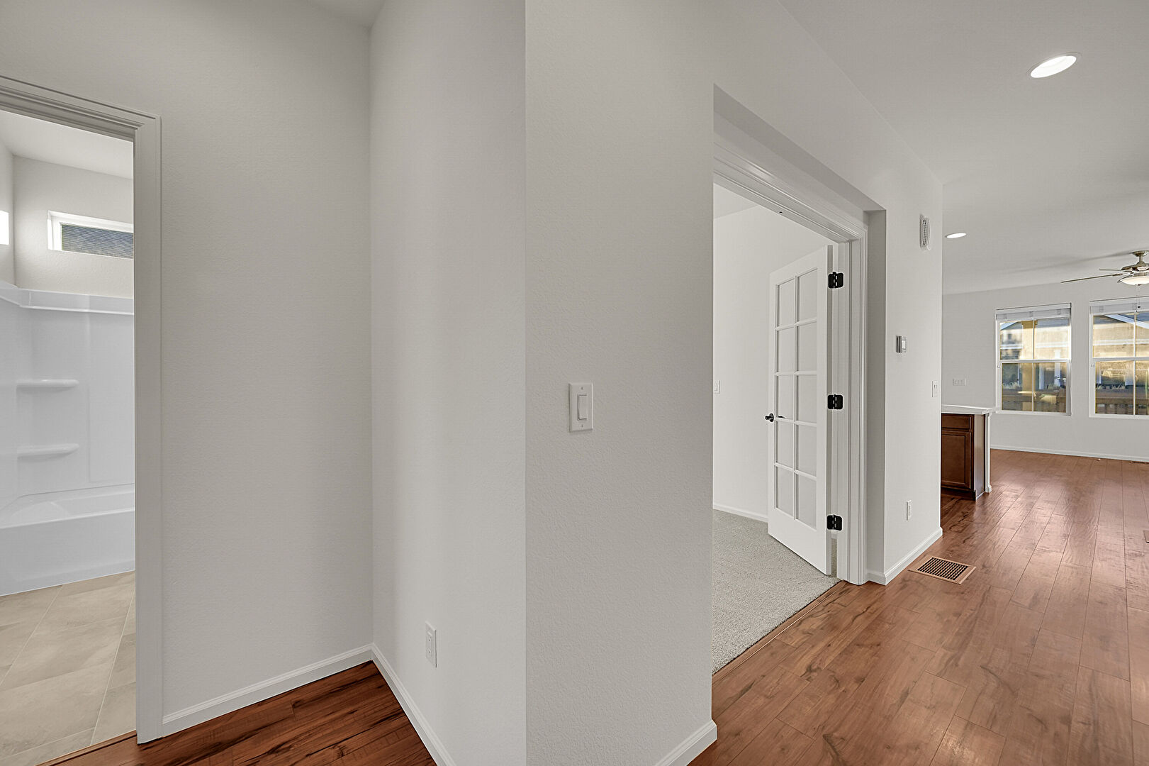 Baseboards Wall, Carpet, Drywall, Natural Light, Recessed Lighting, Vent, Wood Finish Floor, Drywall, Recessed Lighting